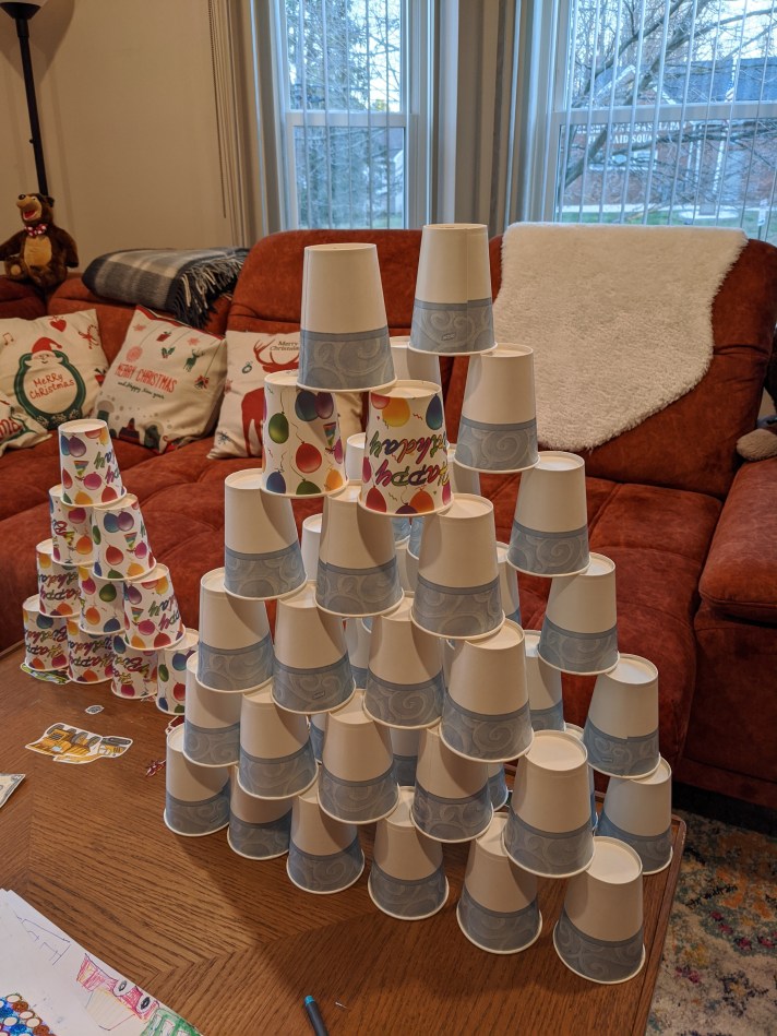 My son Matthew was practicing making a Christmas tree out of the paper cups (see the slideshow carousel – it was a lot of fun 🙂 )!