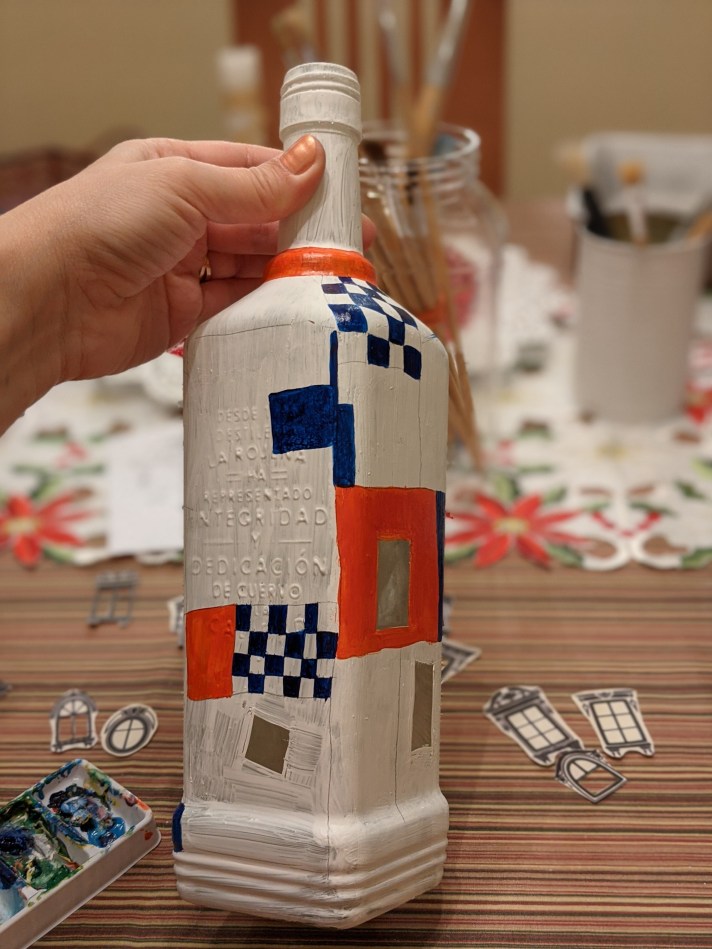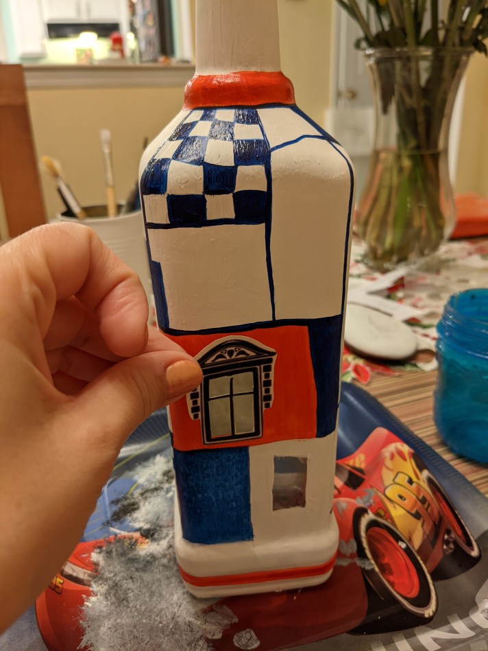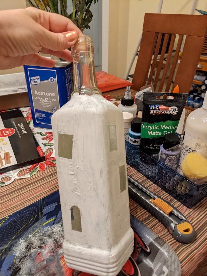 Step 2. Decide where and how want to place the windows on the bottle’s surface and paint those areas with a Elmer’s glue to keep those areas from painting over. Then paint the rest of the bottle with all-purpose primer, avoiding window locations.