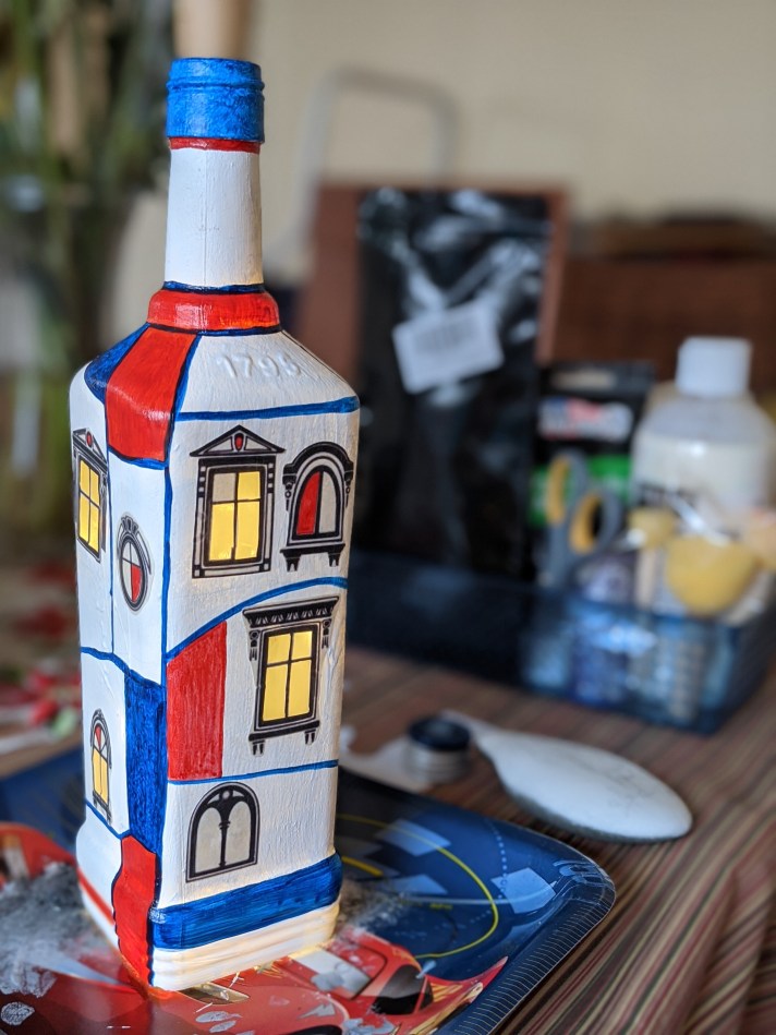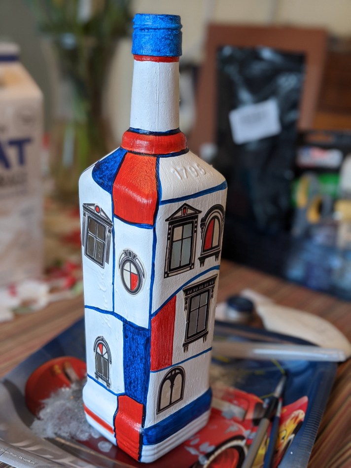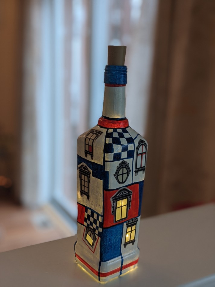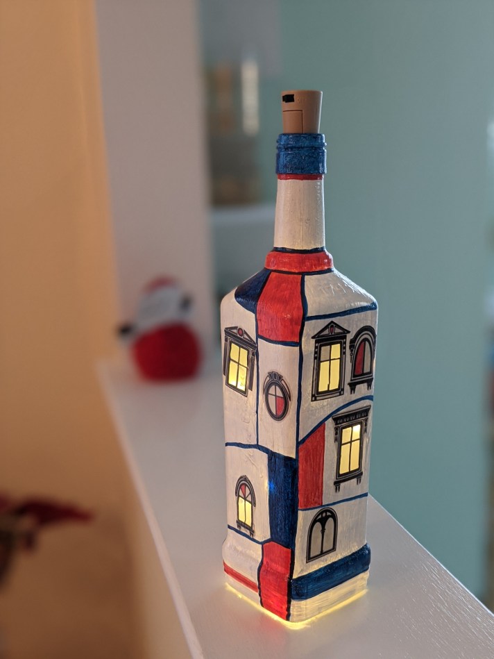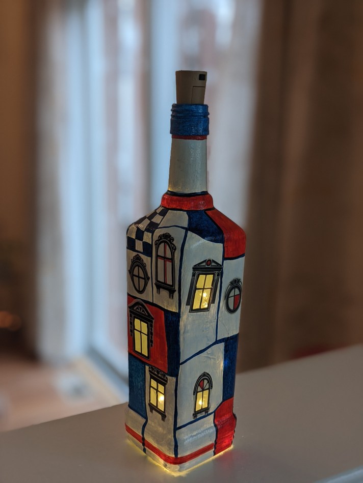 And another fun decoupage project for kids & adults is done! It is a bottle-lantern based on the architecture of Friedensreich Hundertwasser, 20th century European visual artist and architect. A combination of art & architecture always makes every project unique and educational!