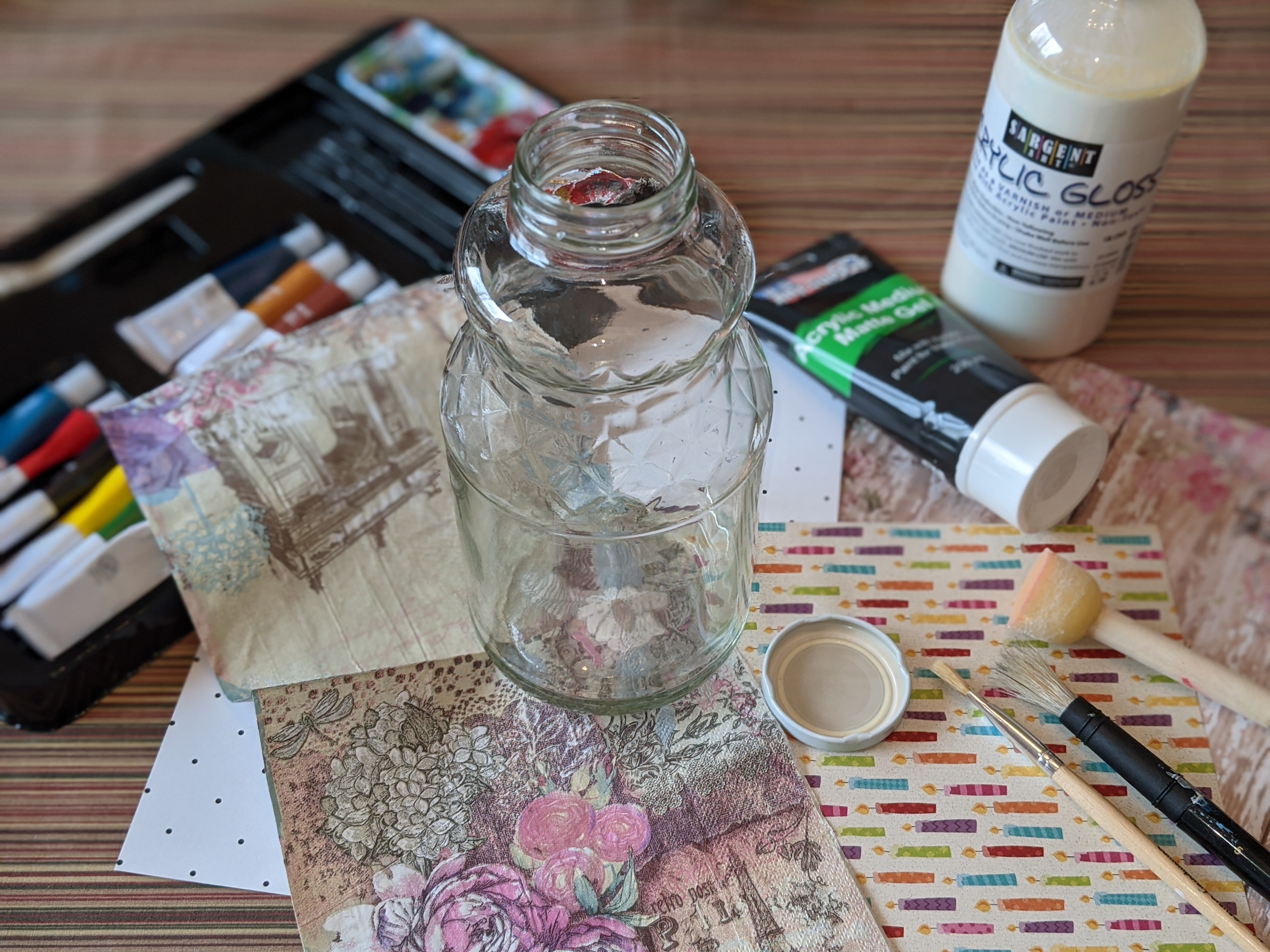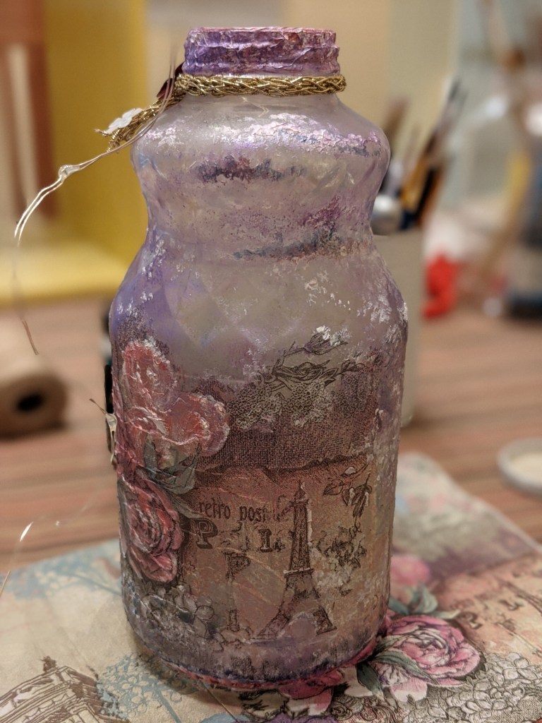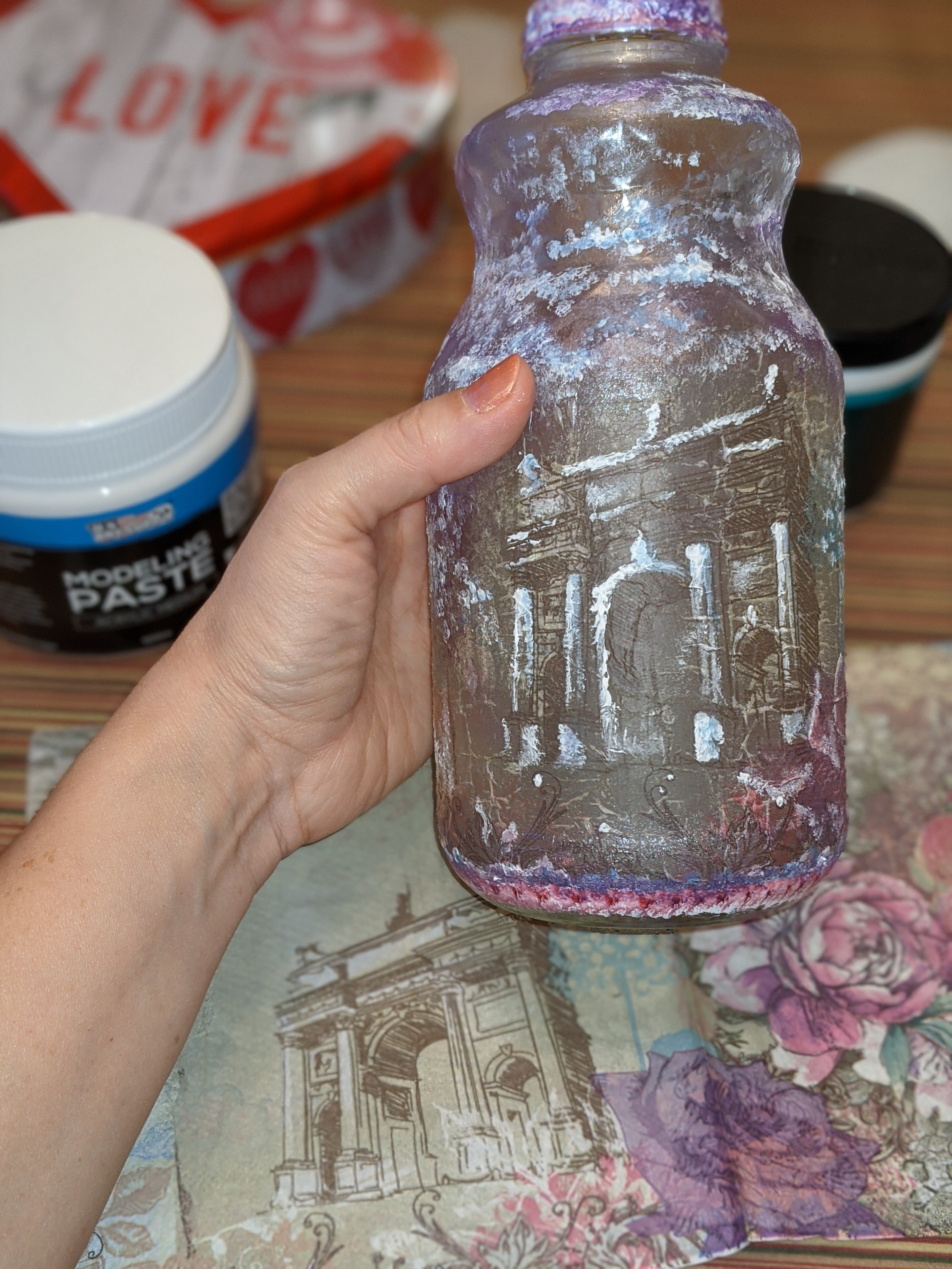 For the project I used a glass jar, acrylic paint, brushes (synthetic #8), modeling paste to create a 3D texture effect, amethyst metallic acrylic paint for a glossy touch up, decoupage glue (any) and a varnish (or acrylic top coat spray).