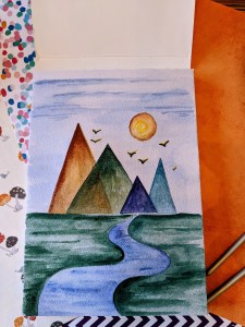 We are also learning about horizon line and perspective, as well as its relation to the mountains and a river. Birds are helping us to see a perspective – the bigger birds are, the closer they are an vice a verse.