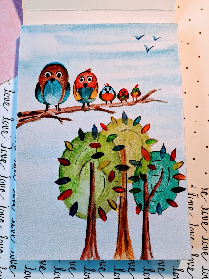 We again start with a tree branch for birds to sit on – this time it is only one branch! Then we create 5 oval and shapes of different sizes. We add their circles for eyes, wings with circular shape on each side of the oval, some feathers on the head, small black triangles for beaks and feet. We also need to draw three oval tree crowns and tree trunks – we will color them with different colors and add funny little leaves to it :).