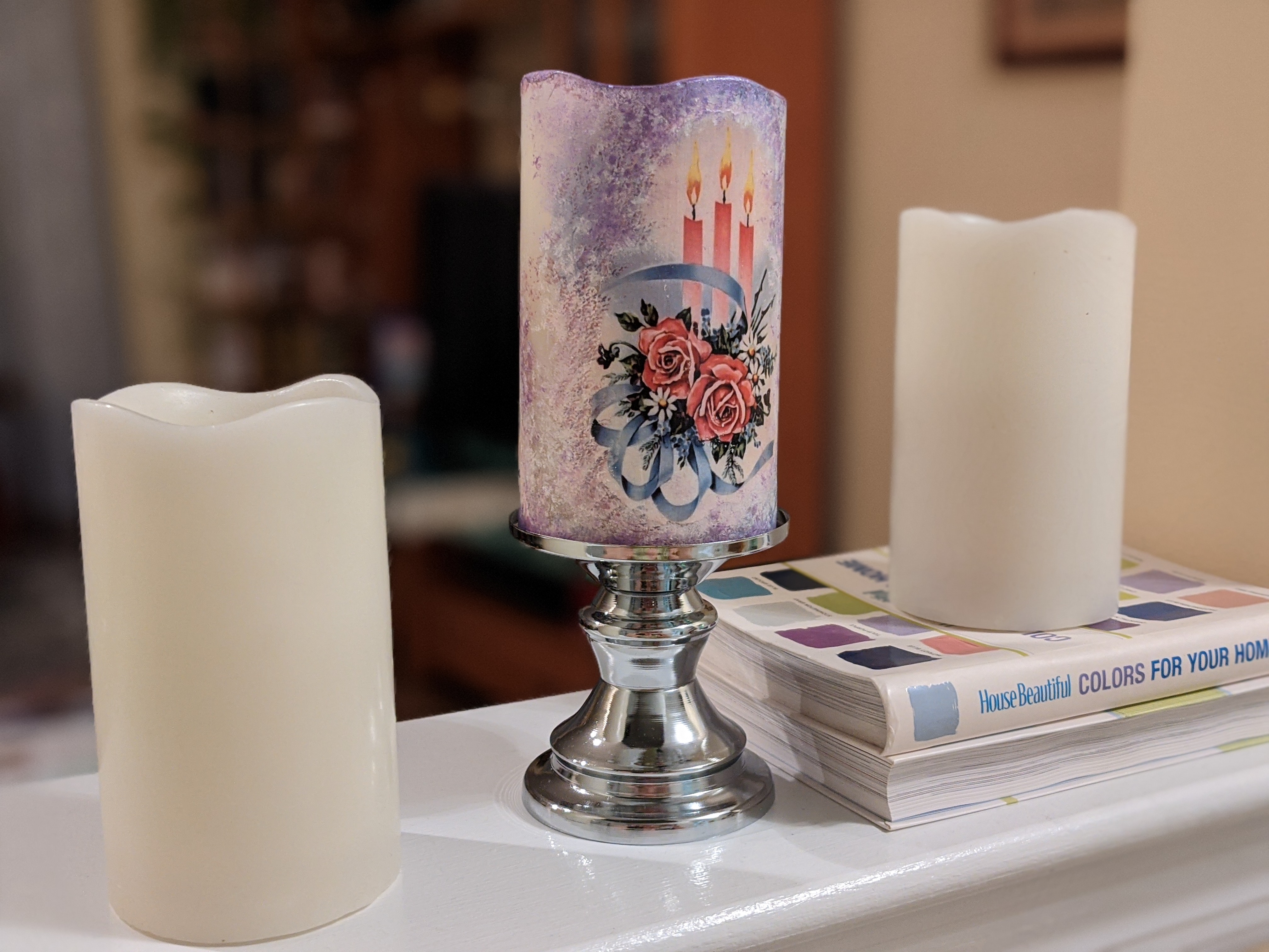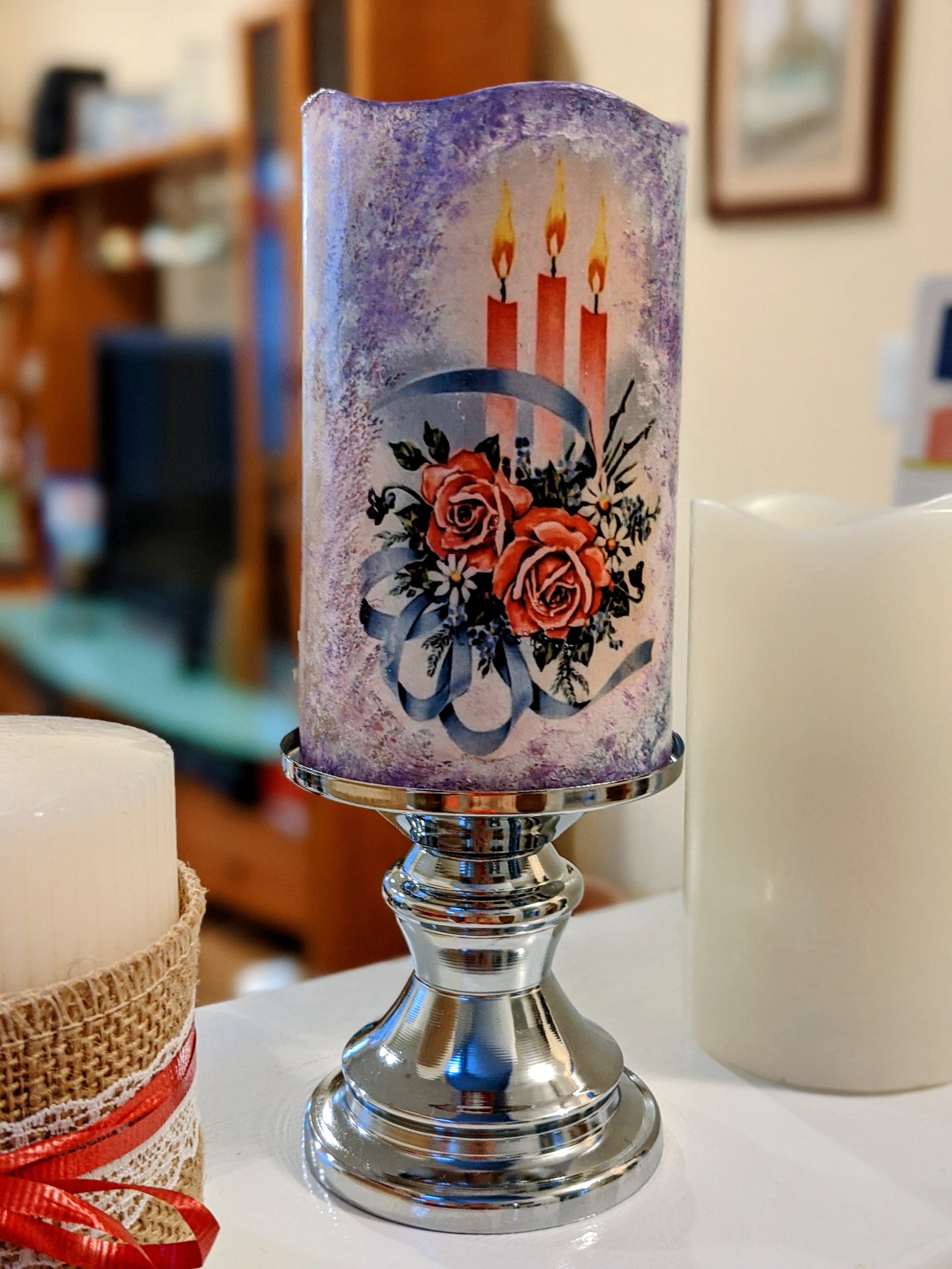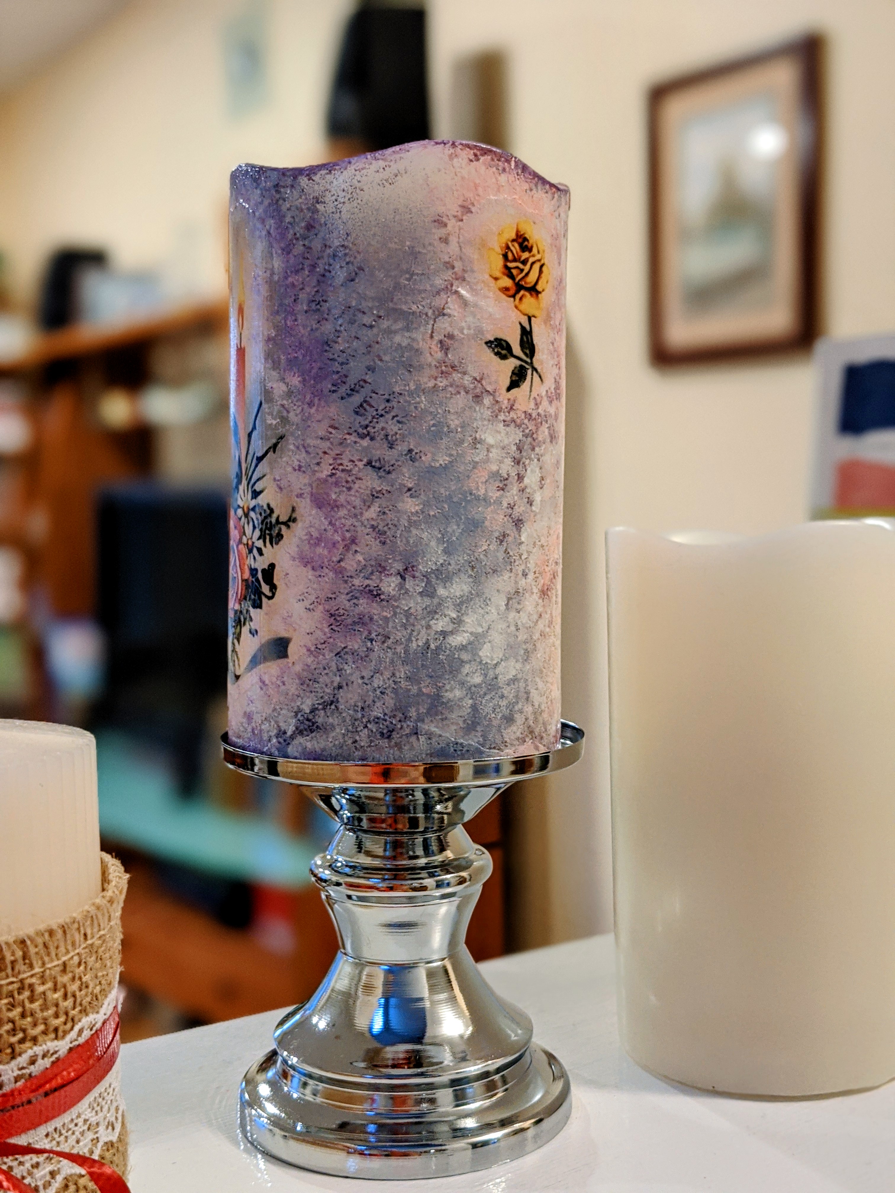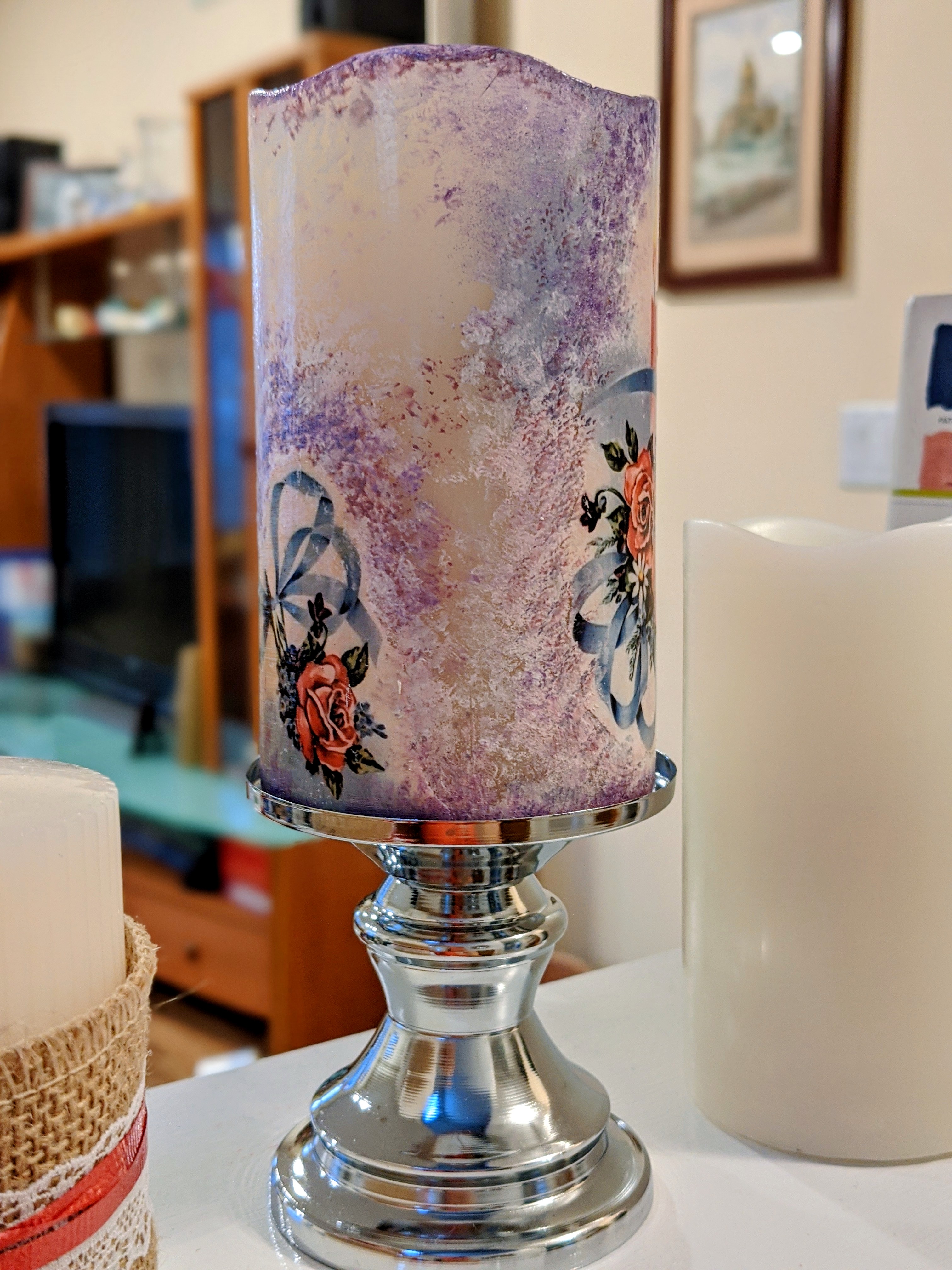This specific project is done on a plastic real wax imitation candles with a decoupage paper, acrylic medium gel (glue), acrylic paint to blend napkin edges and a varnish finish (as a top coat). Please see below the video of the whole process, enjoy and have fun!