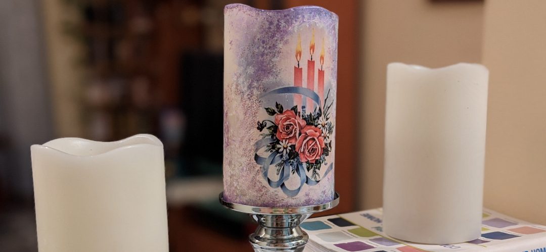 This specific project is done on a plastic real wax imitation candles with a decoupage paper, acrylic medium gel (glue), acrylic paint to blend napkin edges and a varnish finish (as a top coat). Please see below the video of the whole process, enjoy and have fun!