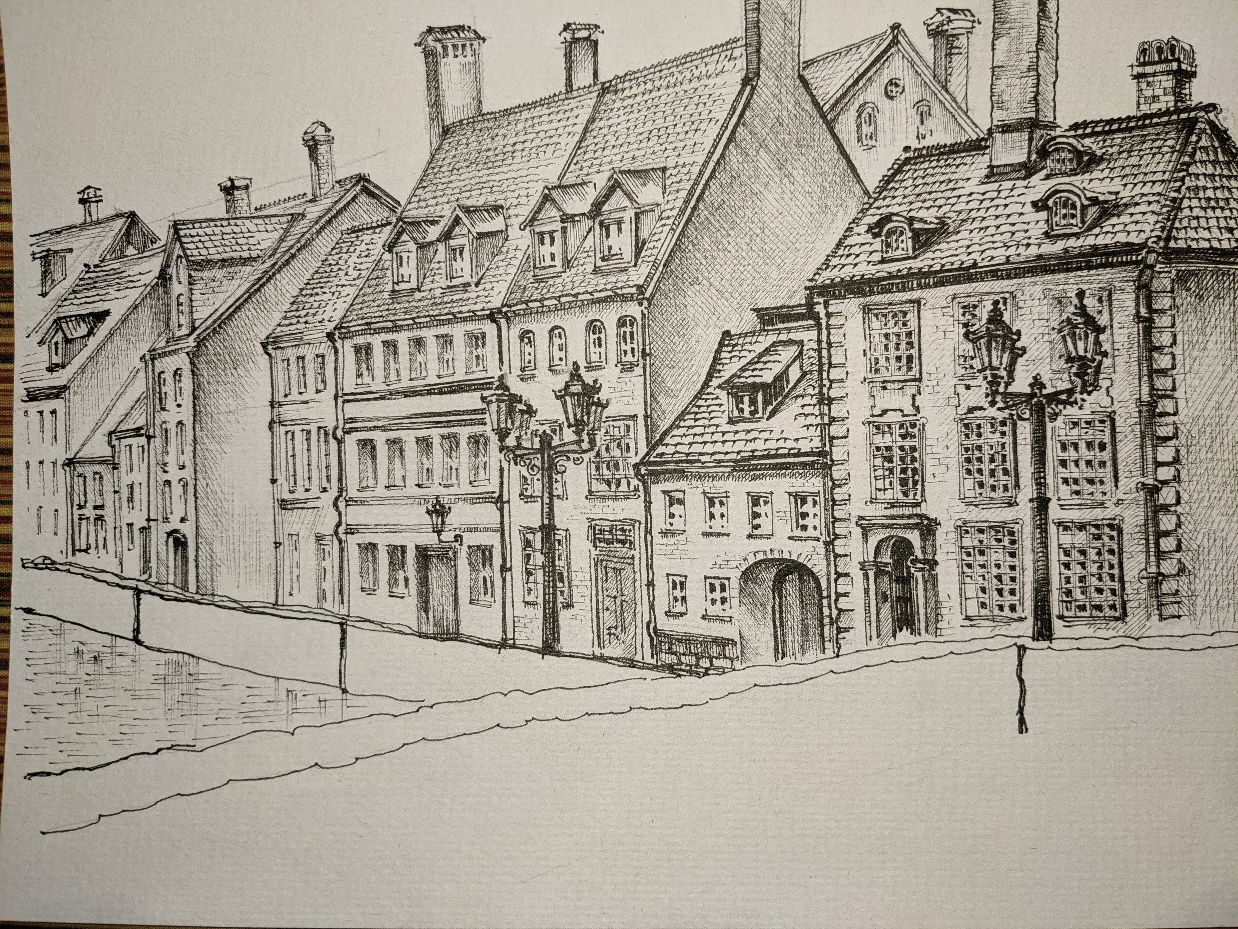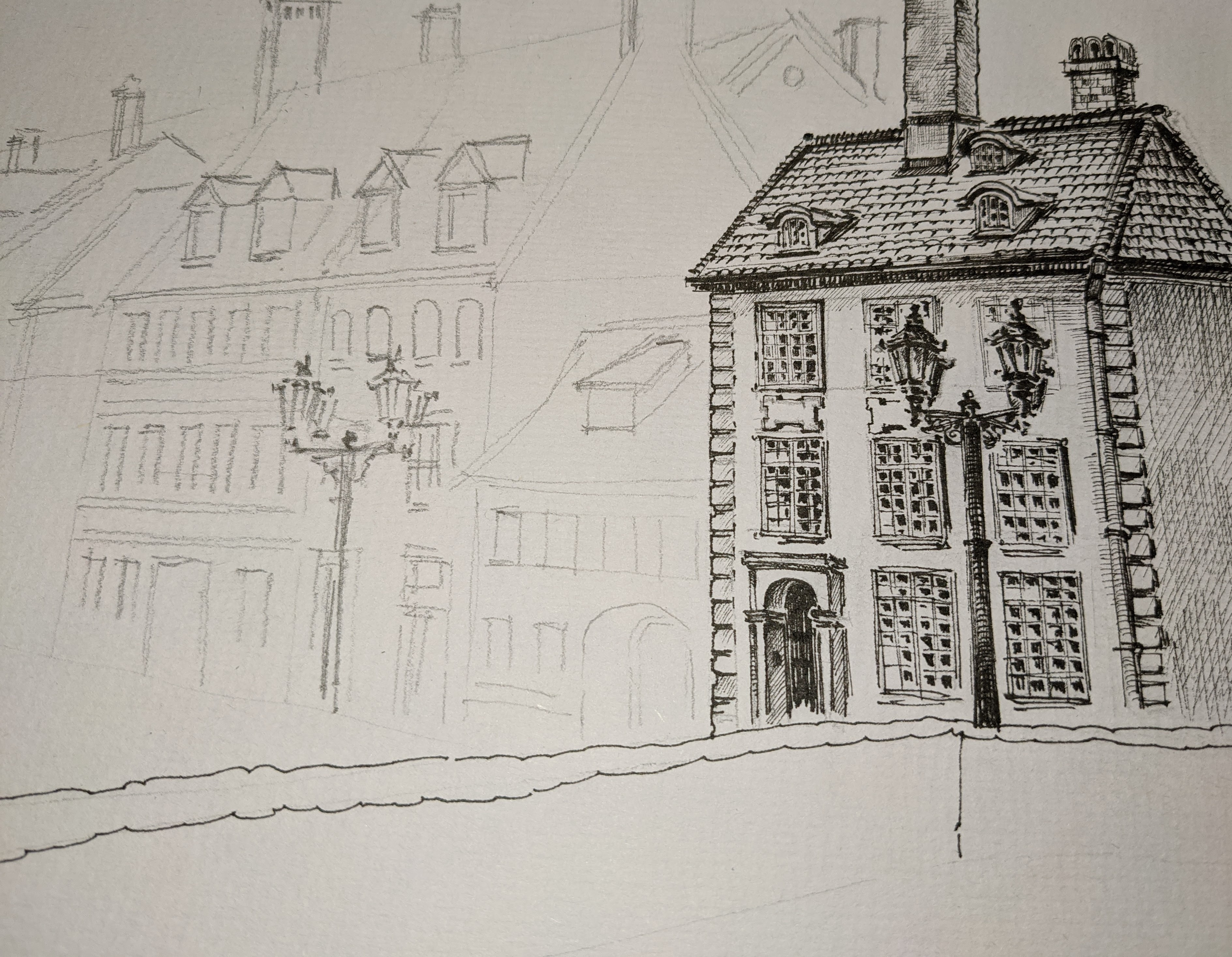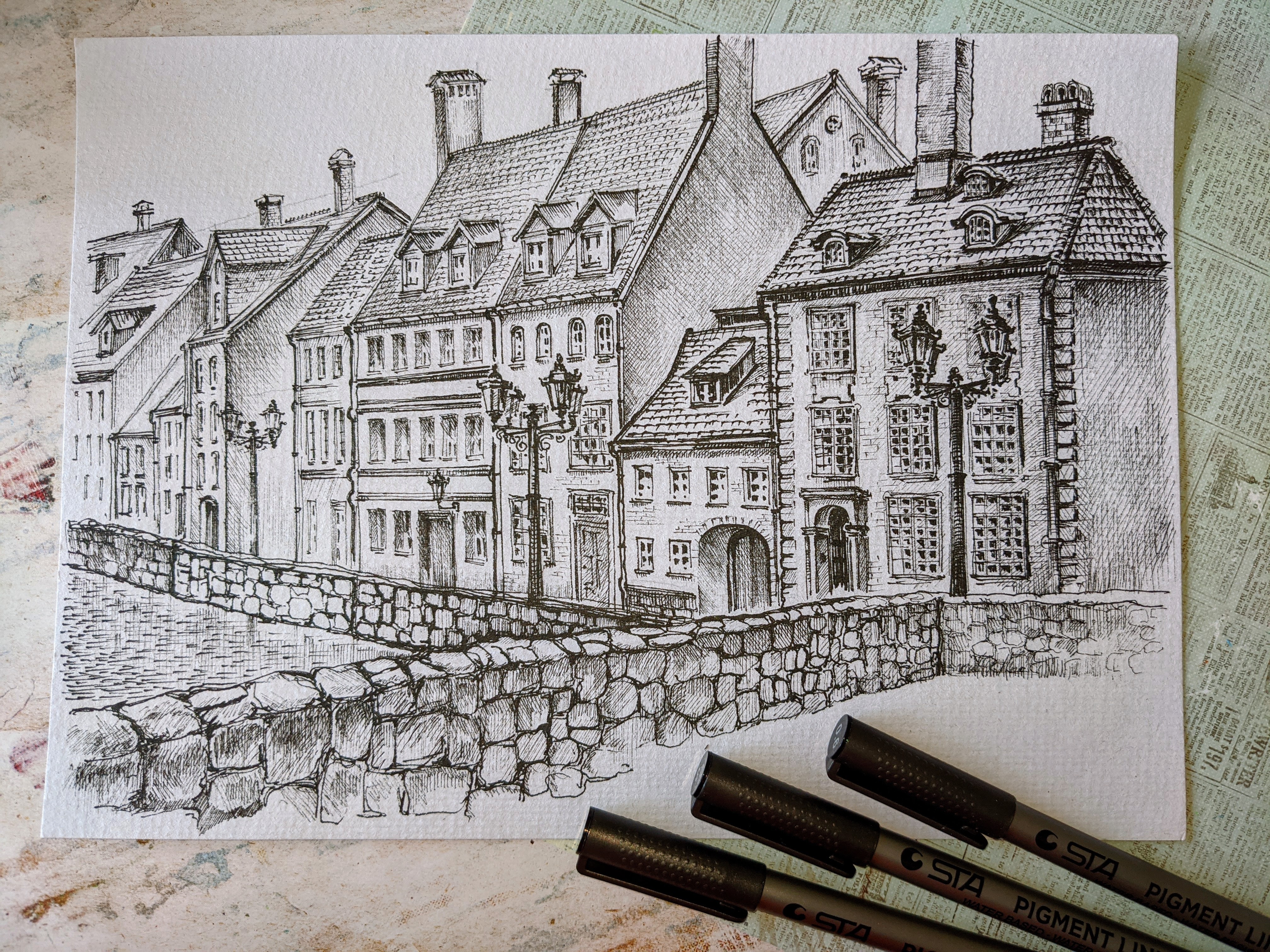 Water resistant liner architectural sketch task for mid and high school (ages 12 and up). Light, shadows & perspective study.
