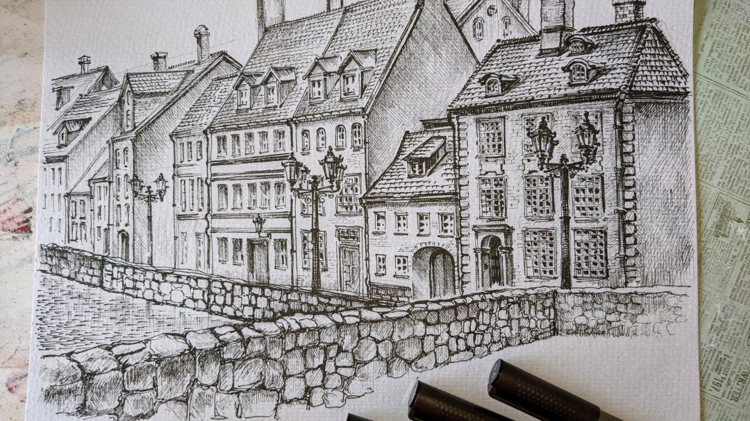 Water resistant liner architectural sketch task for mid and high school (ages 12 and up). Light, shadows & perspective study.