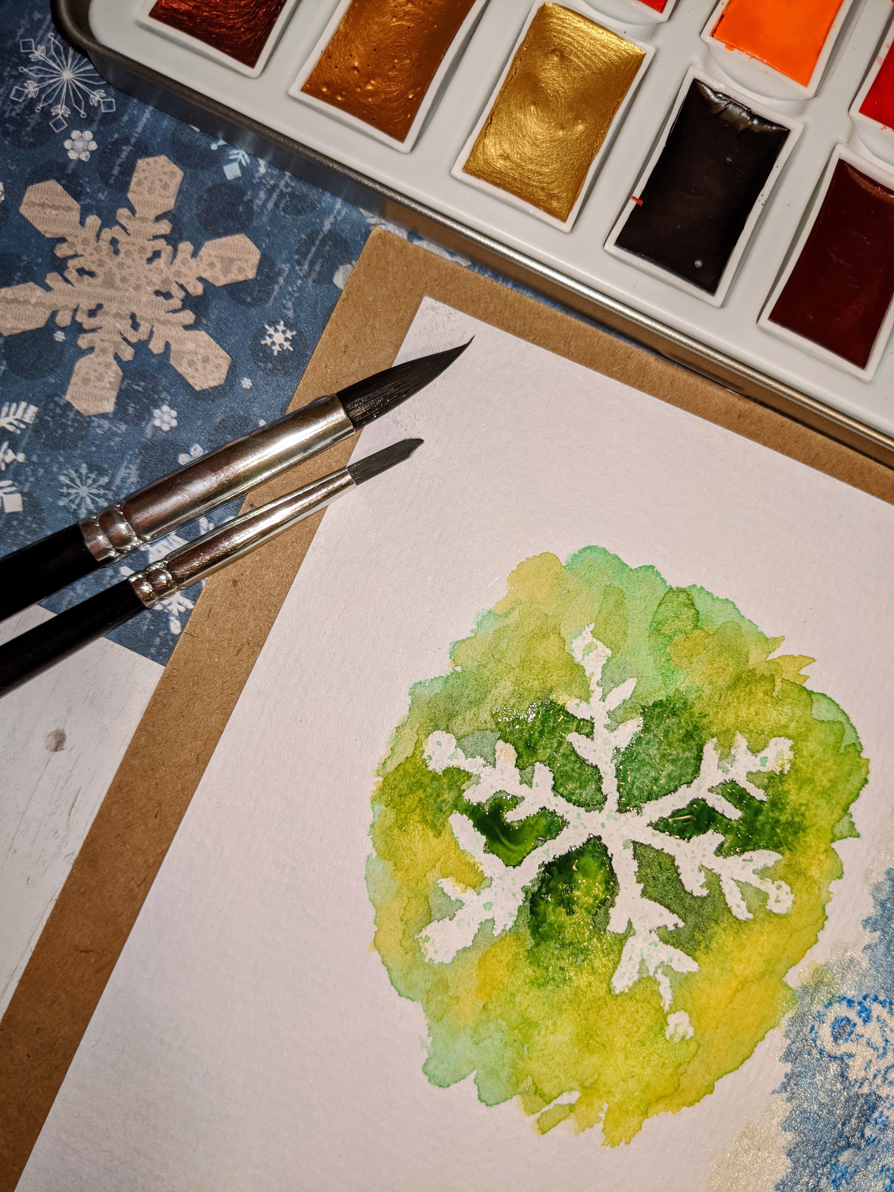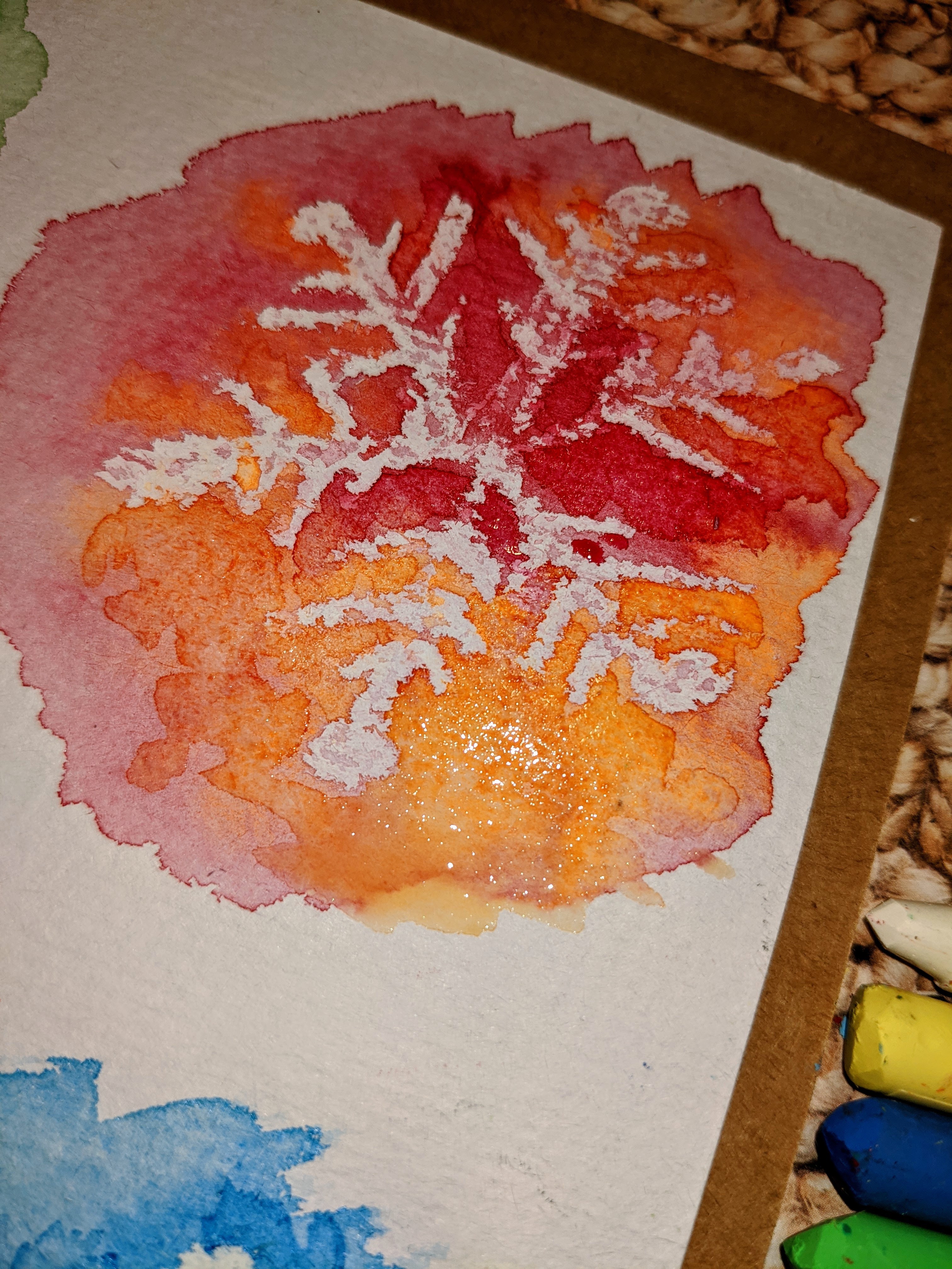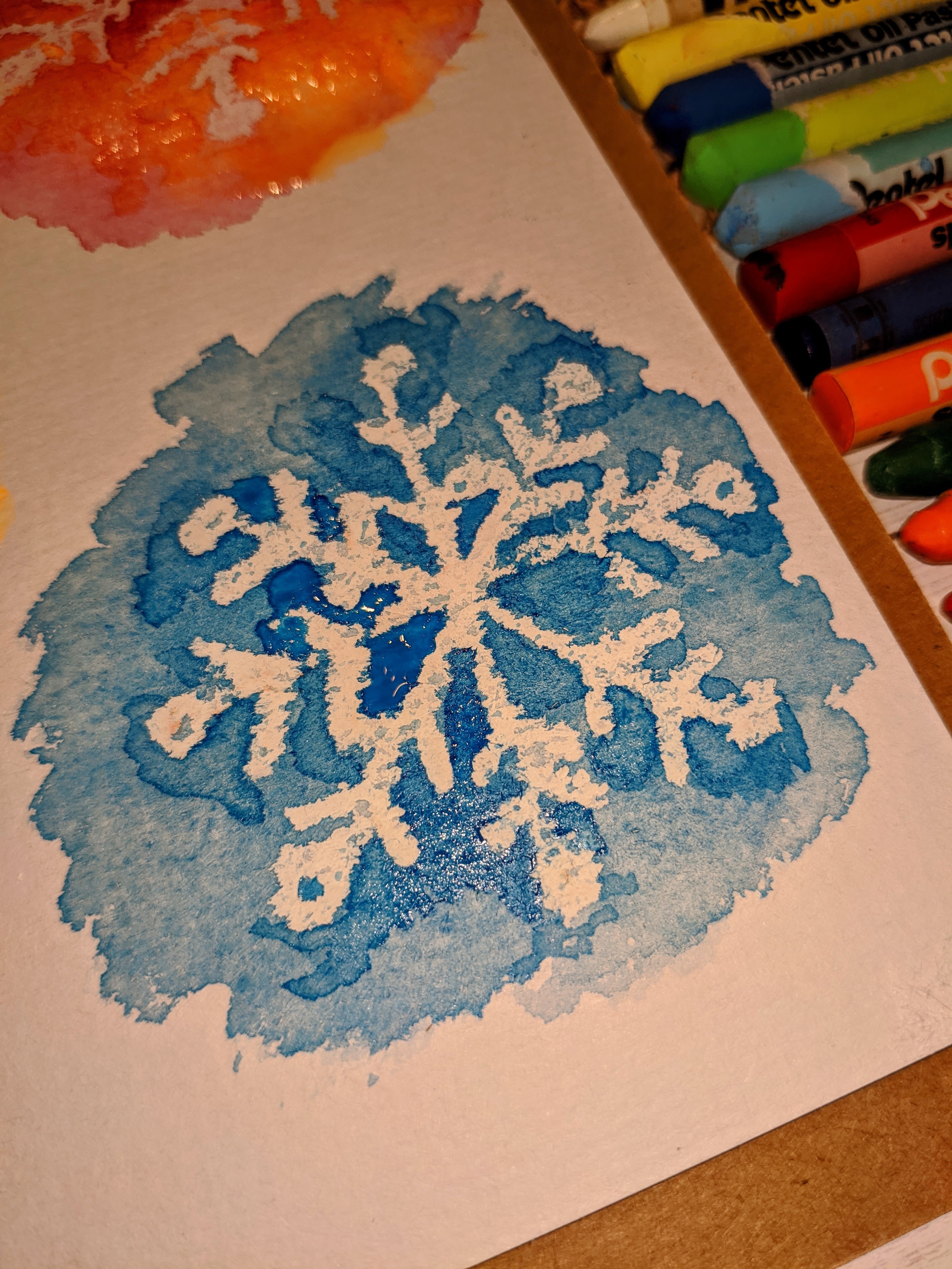 You will need a watercolor paper, white crayons/oil pastels, watercolors and a brush. Draw a snowflake with a white crayon or a white oil pastel bar, and apply watercolor on top of that. You can blend it with water or add a different color for fun. The white crayon lines will pop up and stay white. ![]()