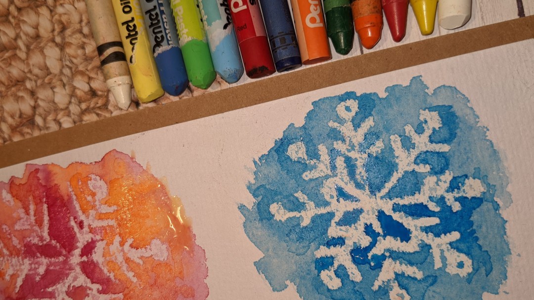 You will need a watercolor paper, white crayons/oil pastels, watercolors and a brush. Draw a snowflake with a white crayon or a white oil pastel bar, and apply watercolor on top of that. You can blend it with water or add a different color for fun. The white crayon lines will pop up and stay white. ![]()