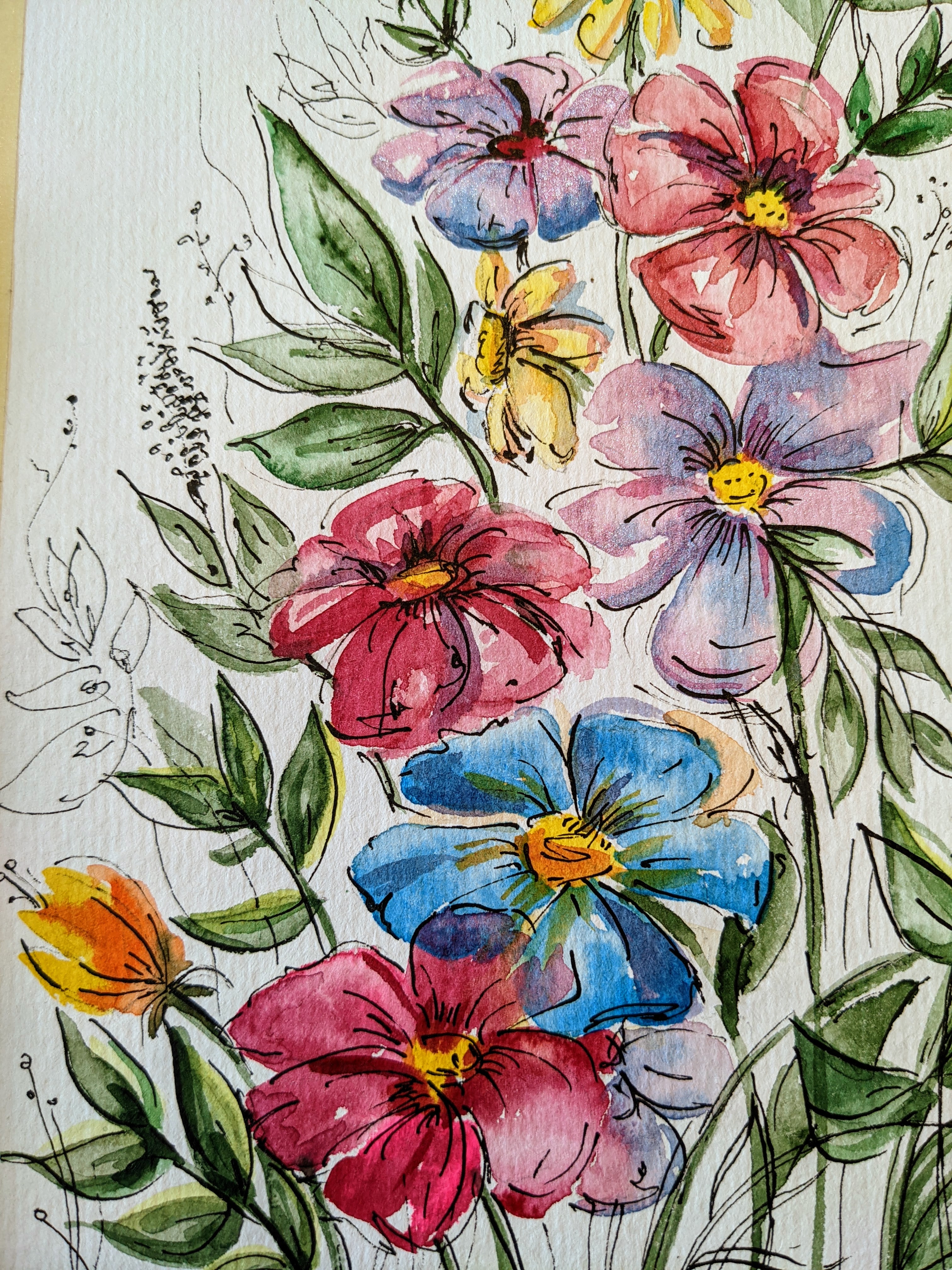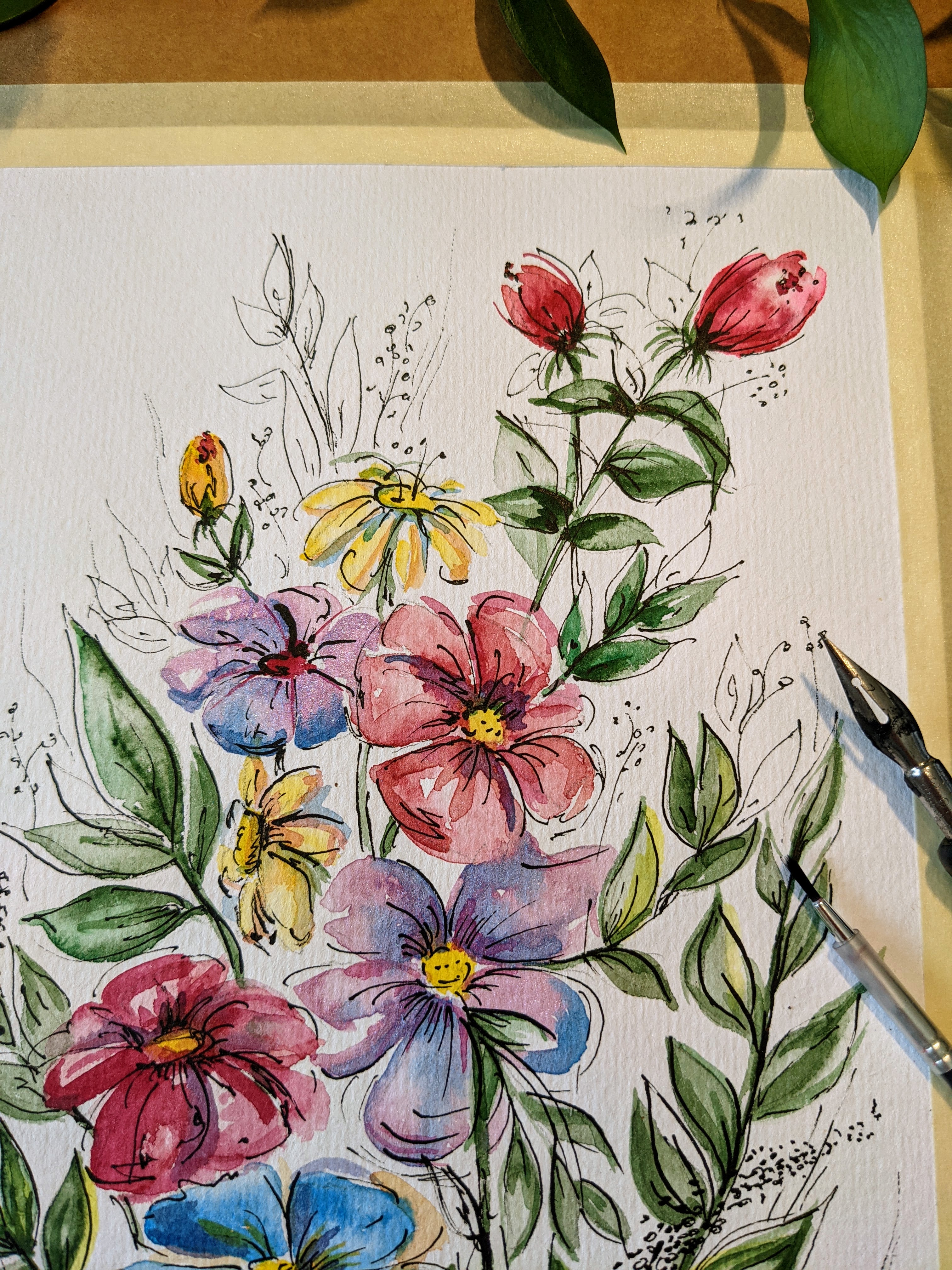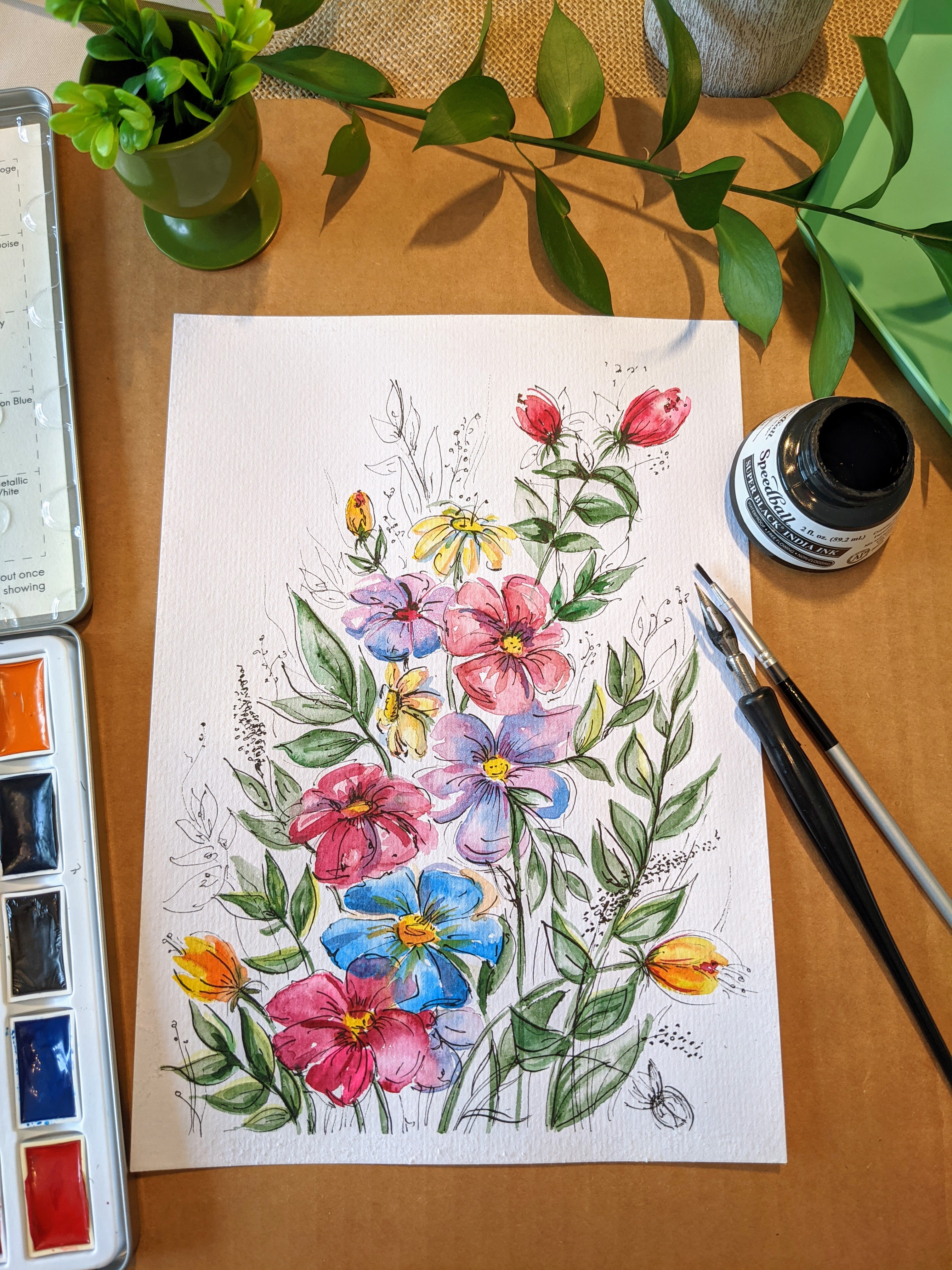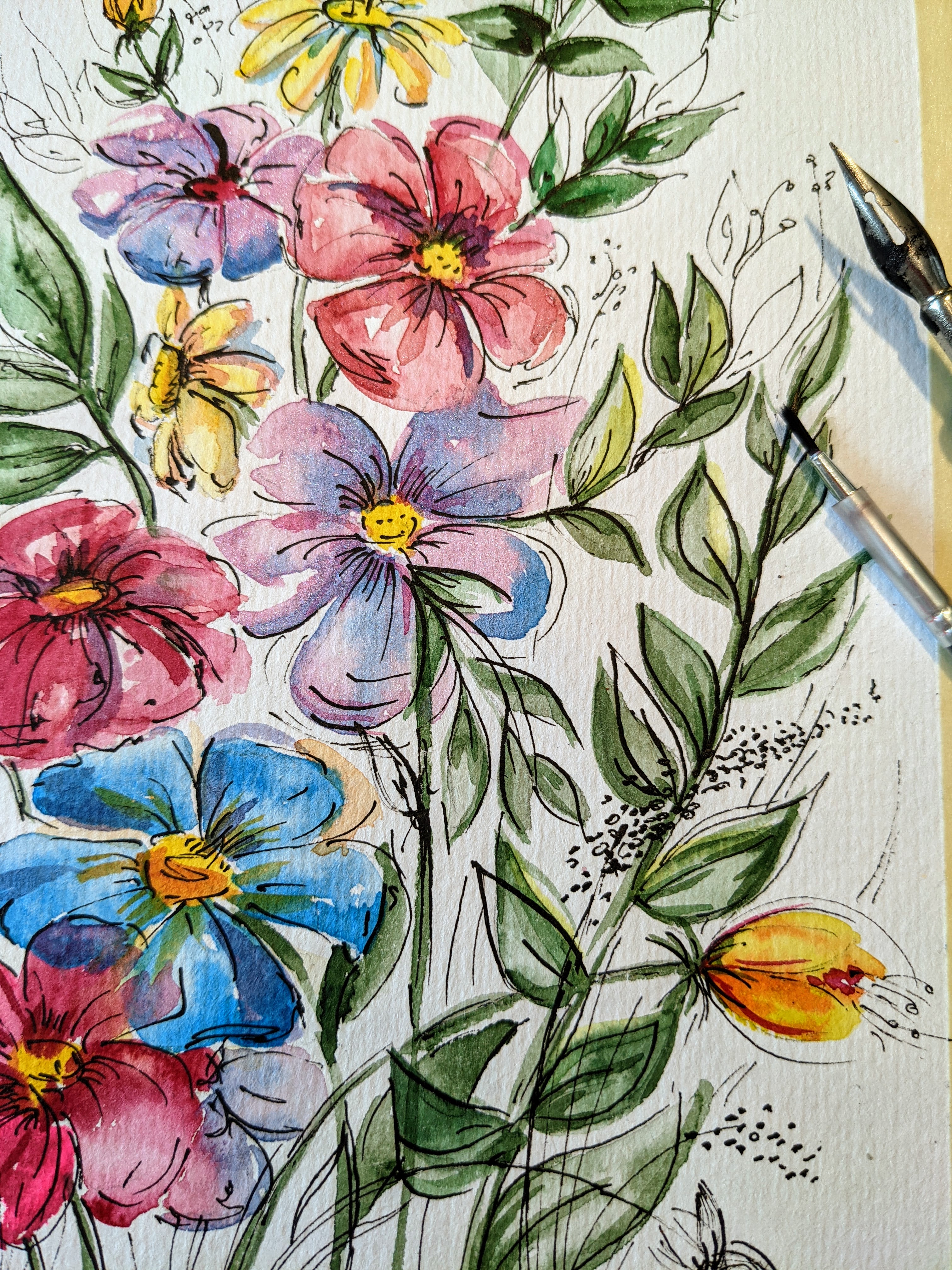 💚Kids tutorial time💚Going green full speed to hurry up spring💚Watercolor and ink combination is another option of mixing artwork mediums for fun! It doesn’t have to be perfect, just start drawing some flowers or greenery with watercolor and then add ink contour (or black sharpie marker) on top of it. Graphics and color combination is a win win exercise to hide imperfections and highlight the drawing💚