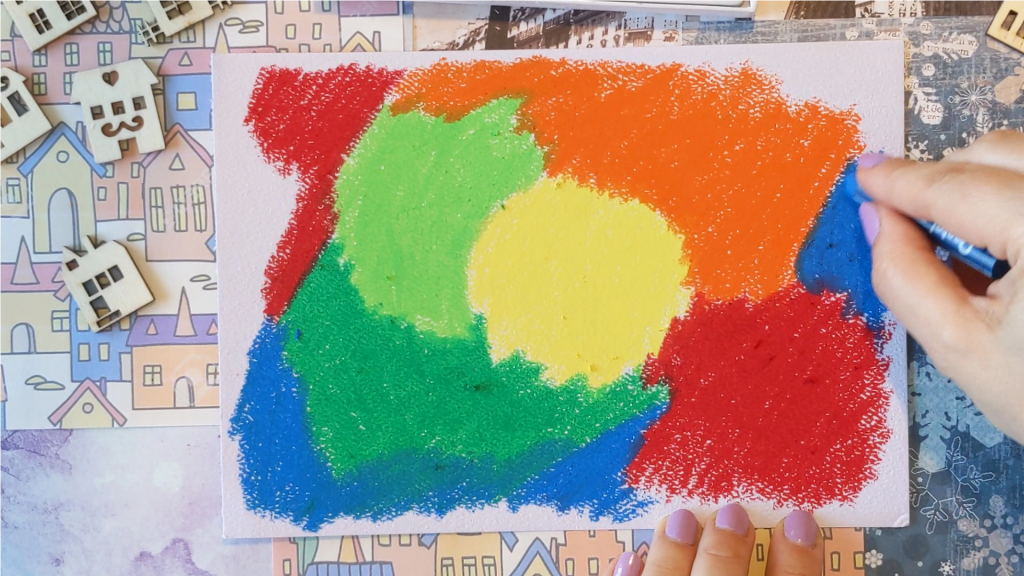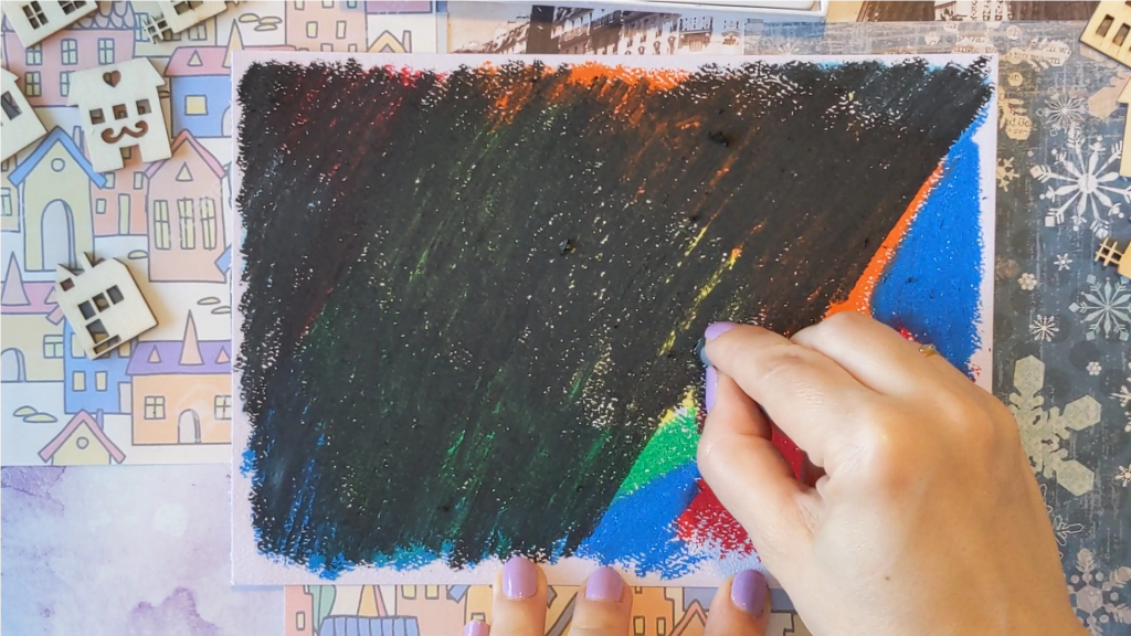 Take a black crayon and draw a top layer all over, covering the lower colorful layer.