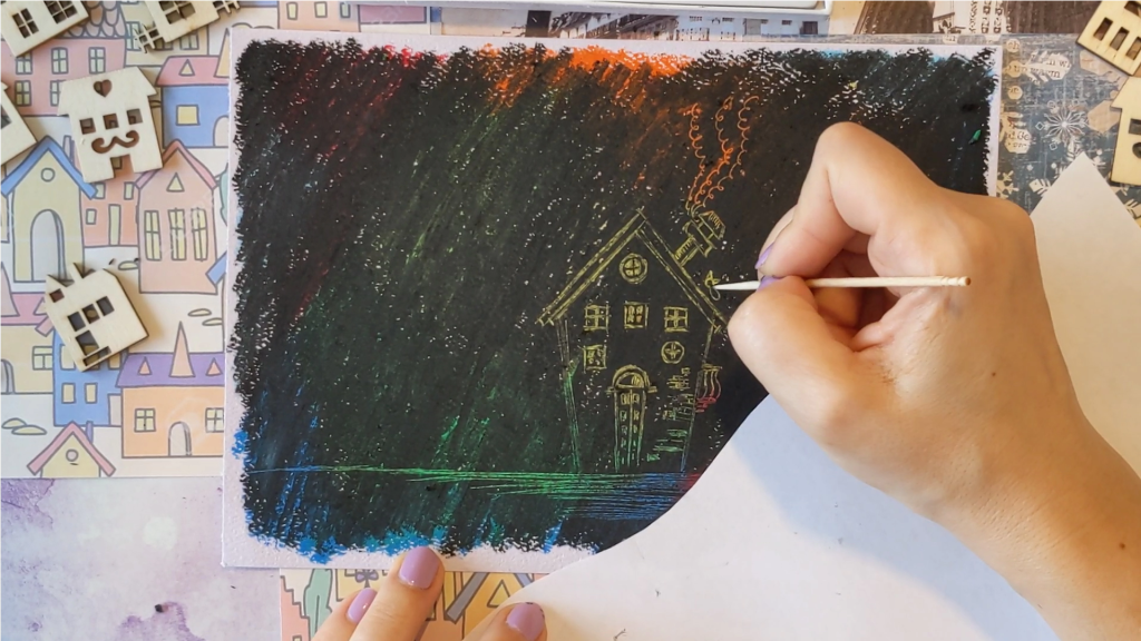 Take a toothpick or paper clip (it is our scratching tools) and start scratching. As you do it, you will see that the colorful crayon layer beneath will show through! Use the scrap piece of paper under your hand to avoid smudging the colors and staining your hand. 🖍️✨