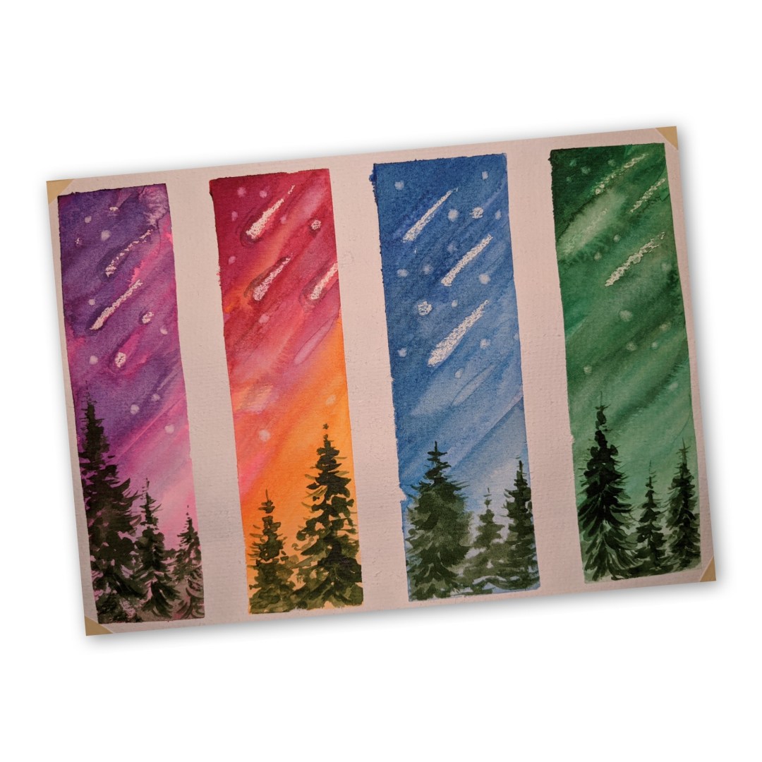 👍Mixing drawing techniques can be very creative – watercolor application over white crayon allows to draw stars and falling comets easily. Draw stars first and then add watercolor on top 👍