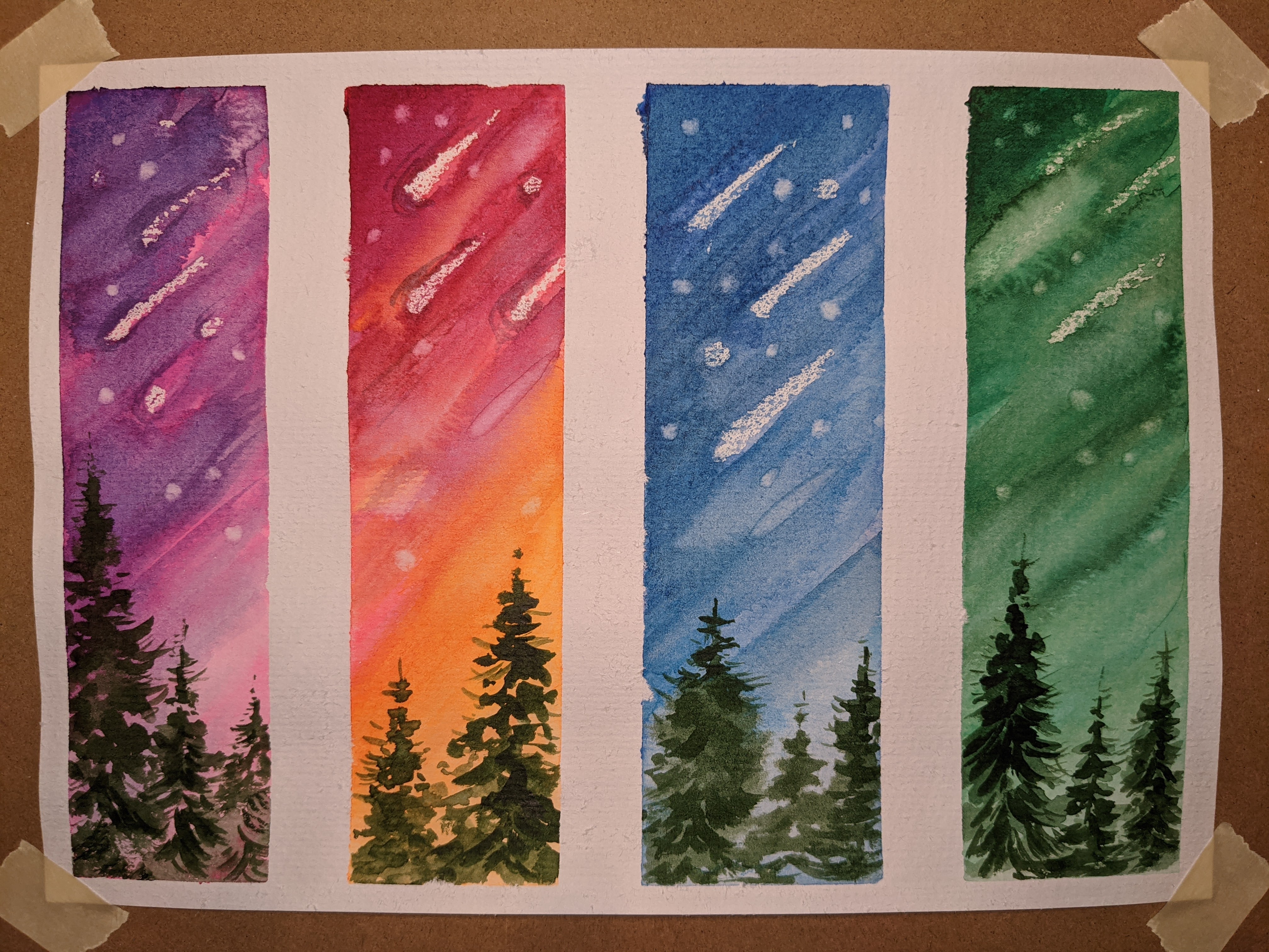 👍Совмещение техник, данном случае акварельной и масляной пастели или мелков, позволяет очень легко и быстро создать эффект звёзд и падающих комет. Сначала мелками рисуются звёзды и кометы, и сверху наносится акварель. Участки со звёздочками остаются белёсыми. Таким же образом можно рисовать снежинки или изморось на стекле👍