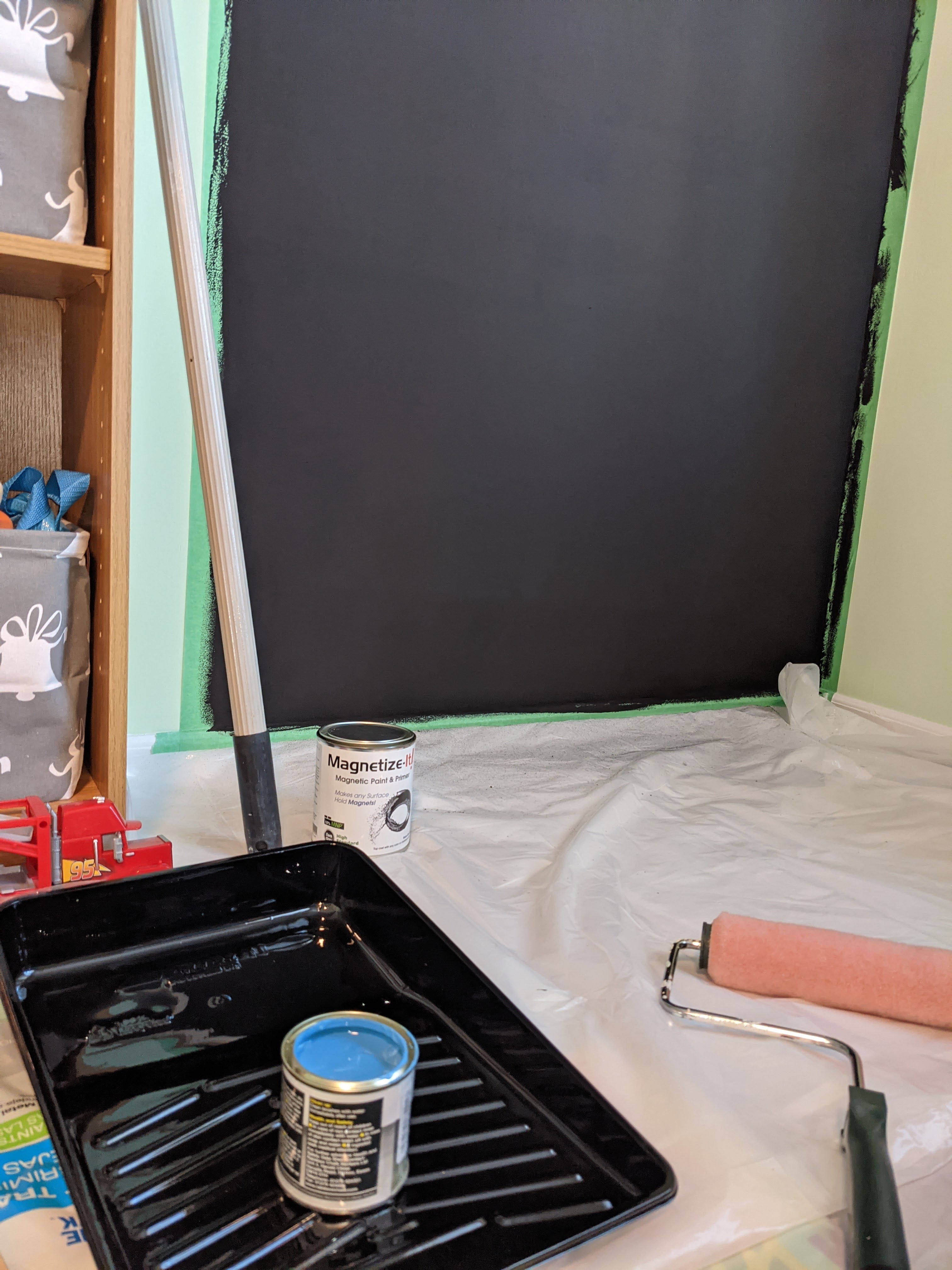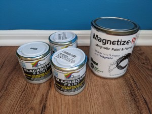 You will need magnetic paint as base coat and chalkboard paint as top coat. You can calculate the amount you need based on the area of paint coverage. We have used 64 oz of Magnetize-It! magnetic paint and 25 oz of blue chalkboard paint. Chalkboard paint and markers are available in multiple colors. You can also skip magnetic paint if you are not interested in magnetic wall or skip the chalkboard paint and paint with regular wall paint if you want to use it as a magnetic wall only. Keep in mind that magnetic paint paints black so you will need several coats of regular paint to cover.