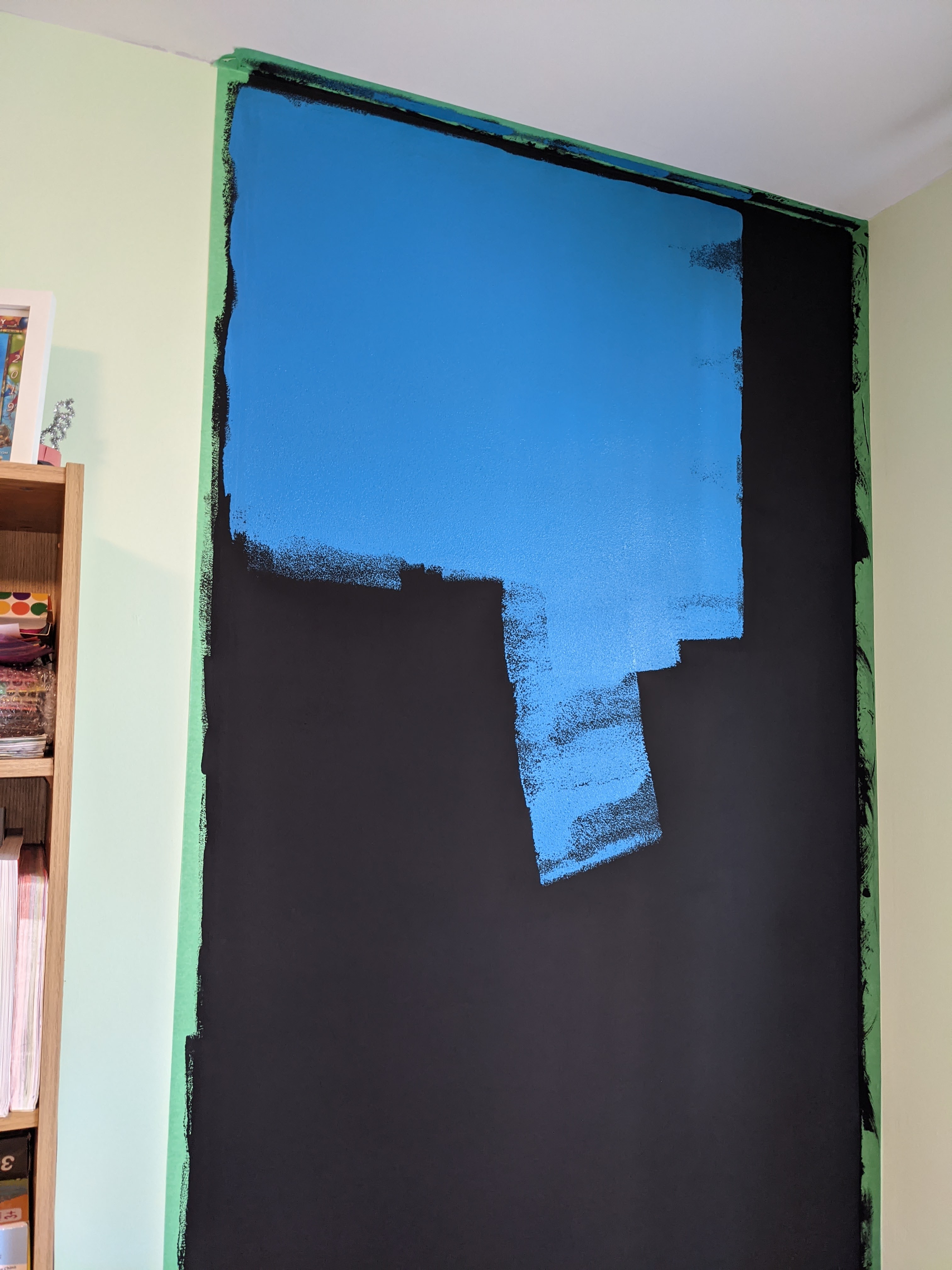 Instructions suggest to wait an hour between coats but we waited just enough to let paint get dry to the touch – about 20-30 minutes. Once it all dries up (do 12 hour break for better results), you can apply the chalkboard paint. Again, we did 3 coats, as our area is pretty large and had to be even. If you have much smaller area, you can do even 1 layer – the chalk markers will draw perfectly in this case too (I tried 🙂 ).