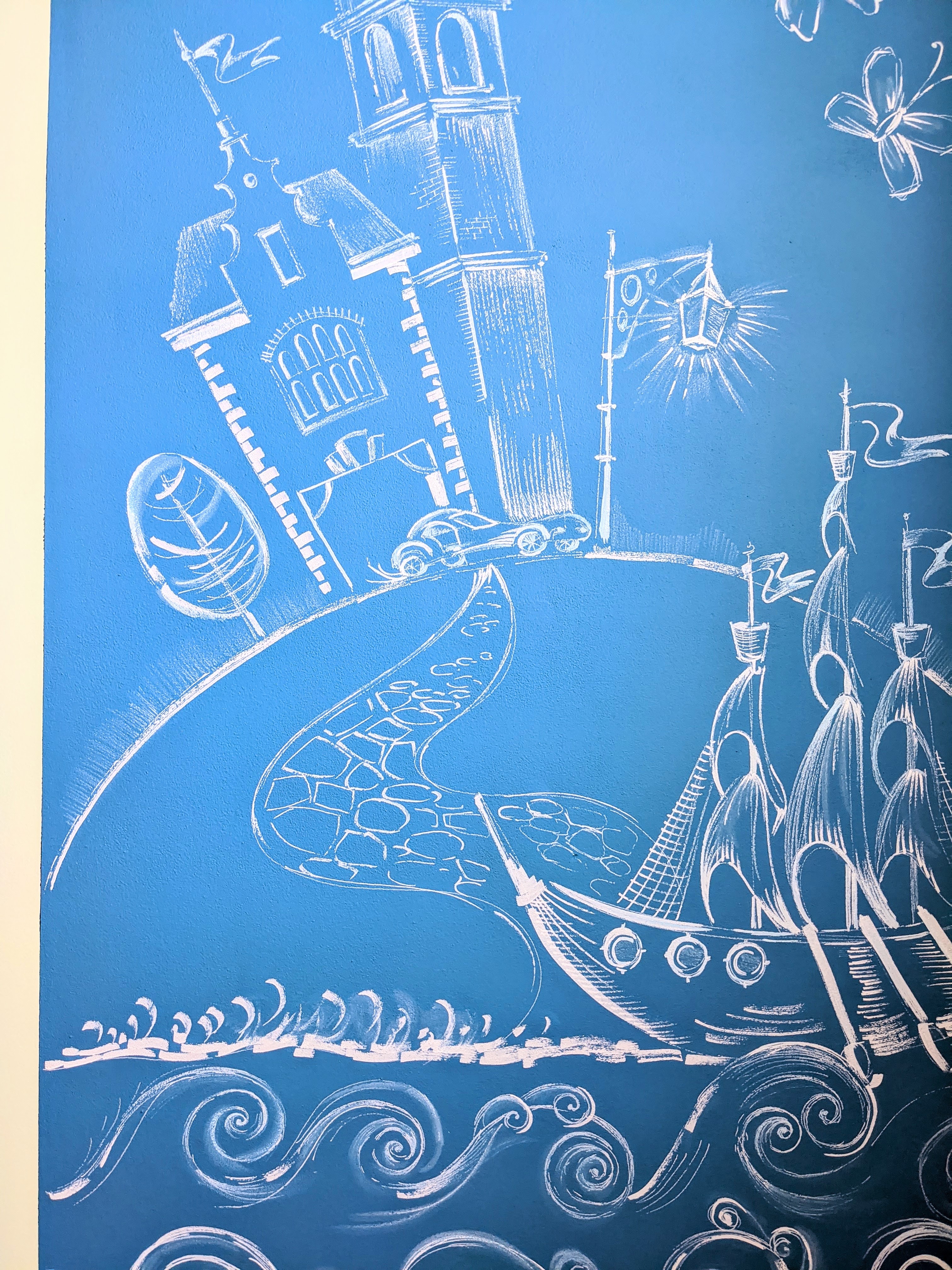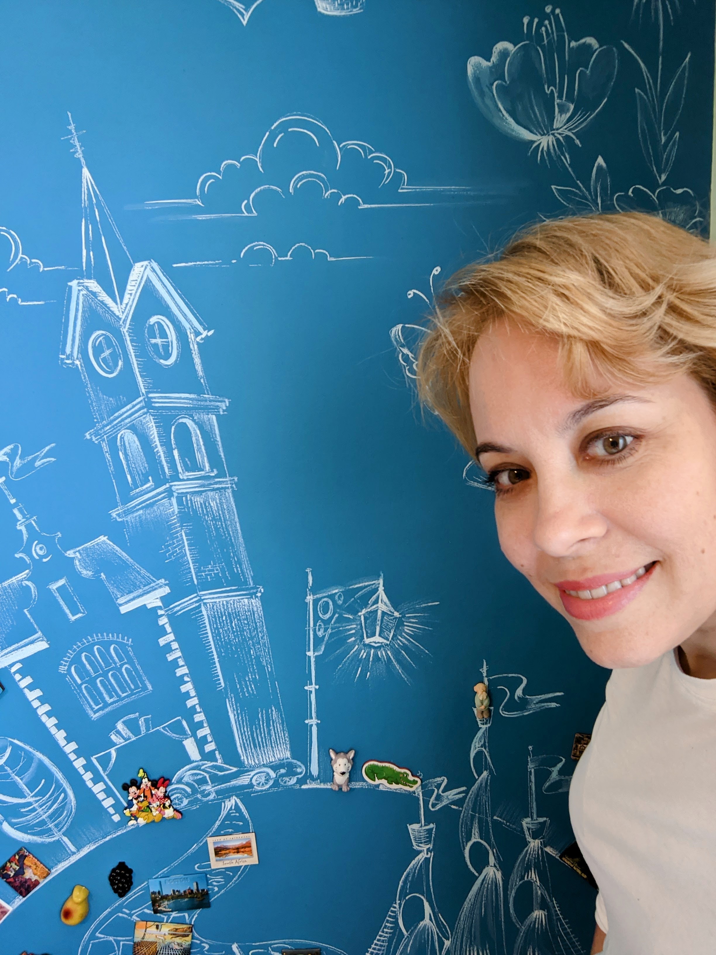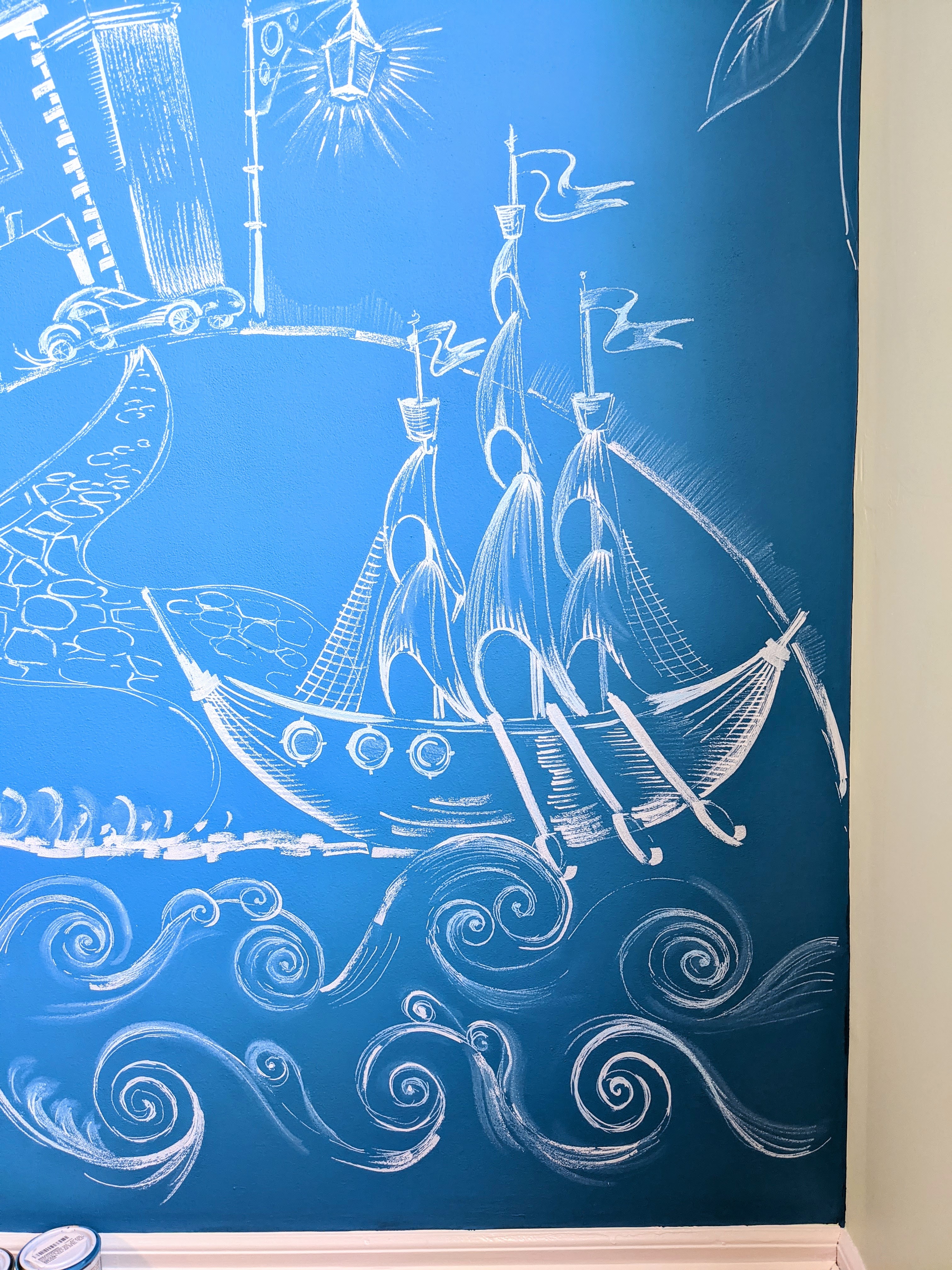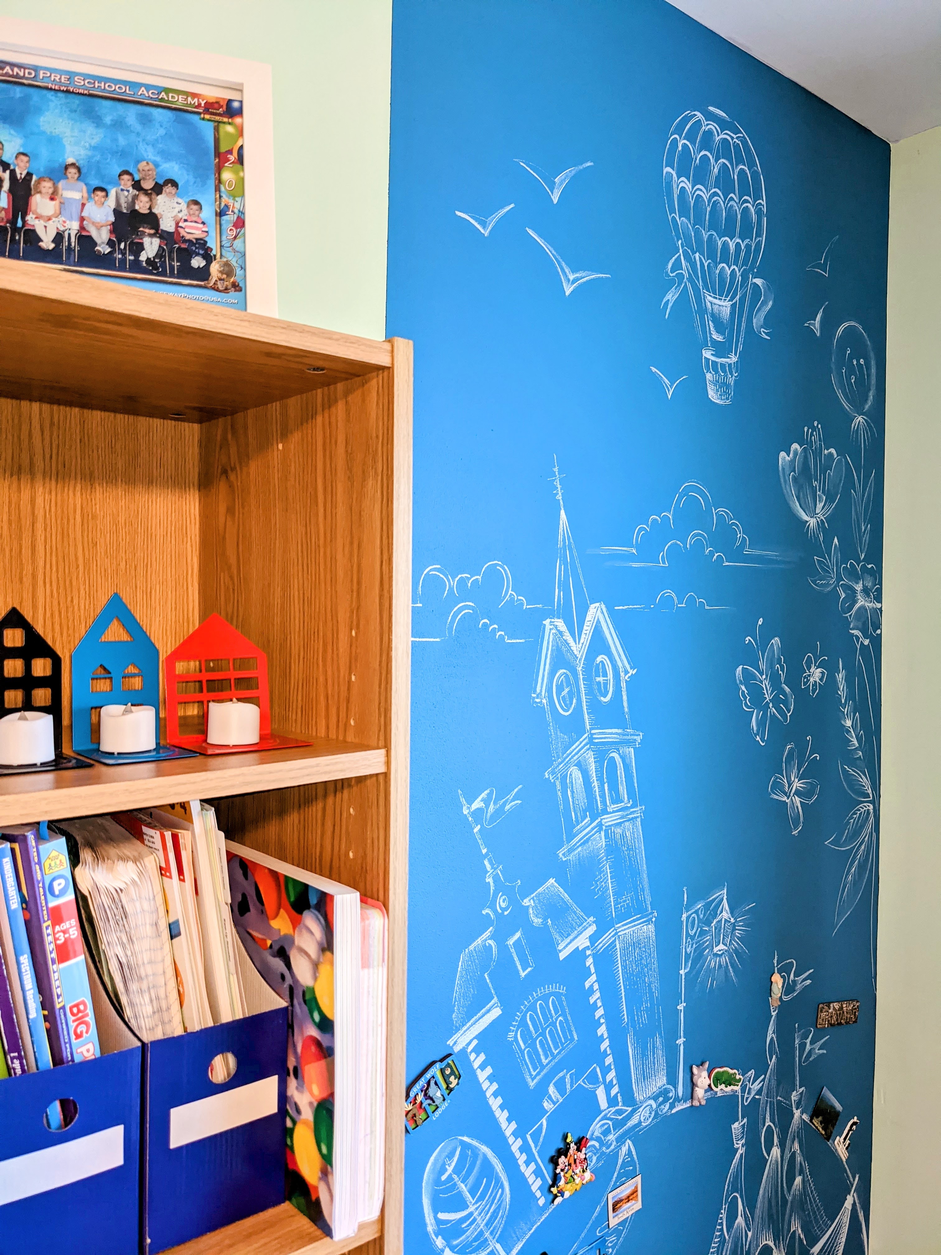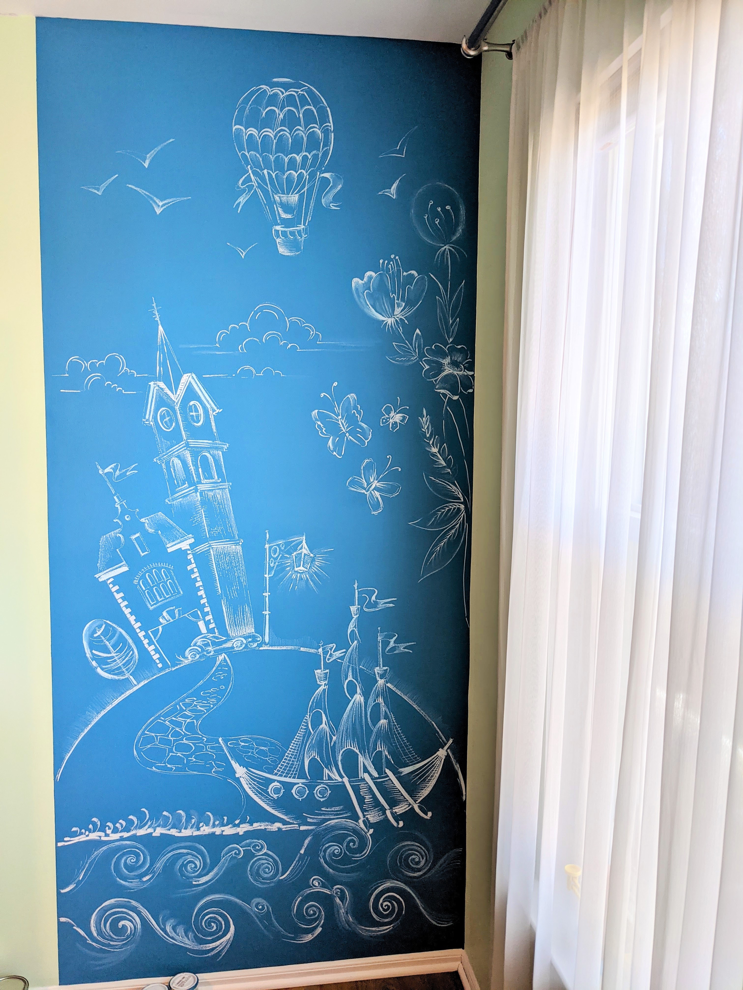Watch our videos (Part 1 and Part 2) and step-by-step photo gallery below for amazing design ideas at kids bedroom or any room of your choice! A combination of “Magnetize-it!” paint as a base coat and blue Chalkboard paint as a top coat allows you to 1) stick magnets to the wall 2) draw on the wall with washable chalk markers! This is a sample video of what you can create on your wall fast and easy! Please like and subscribe to our YouTube channel and http://www.nikaartdecor.com for more painting tutorials and interior design DIY ideas!