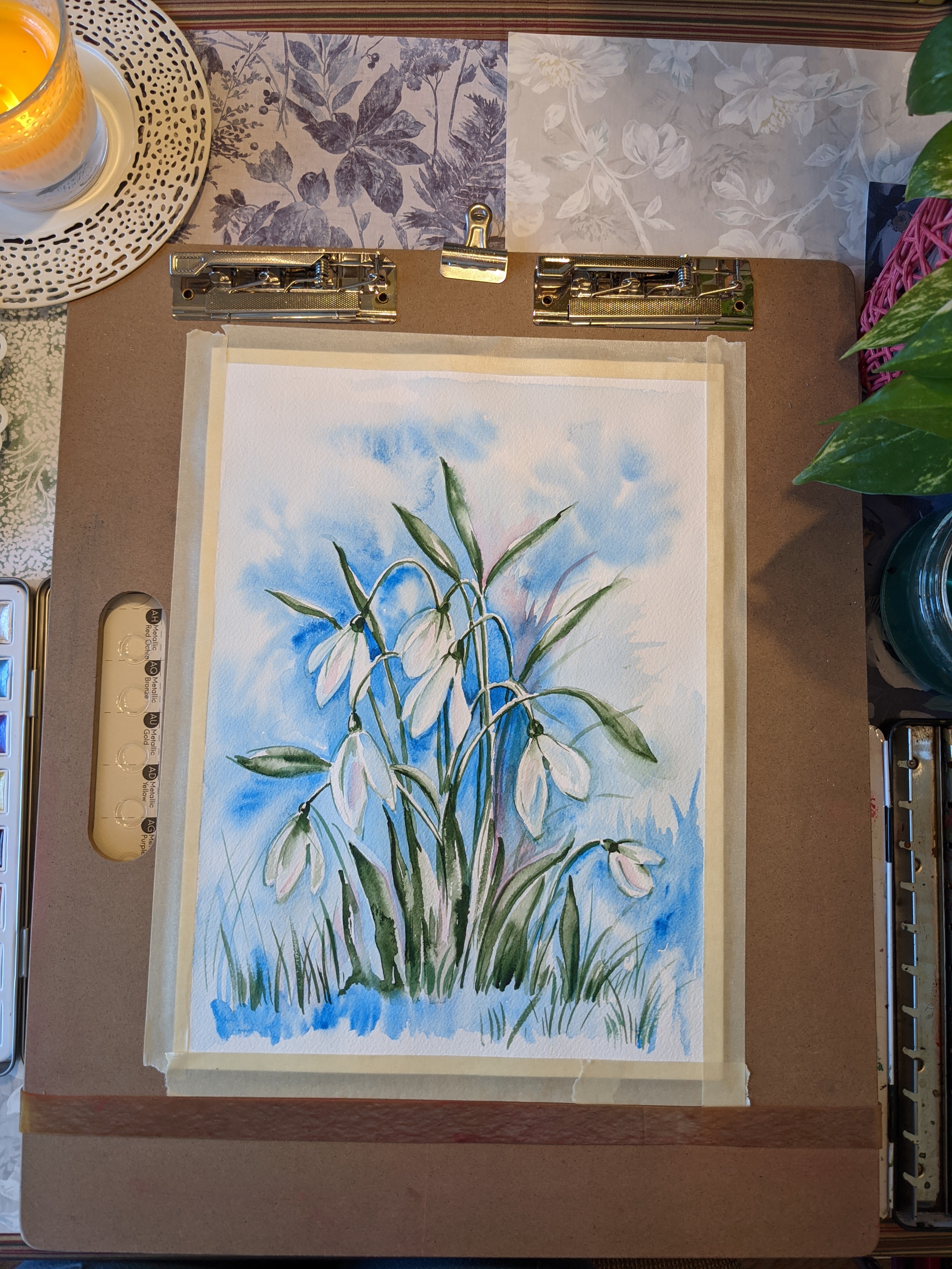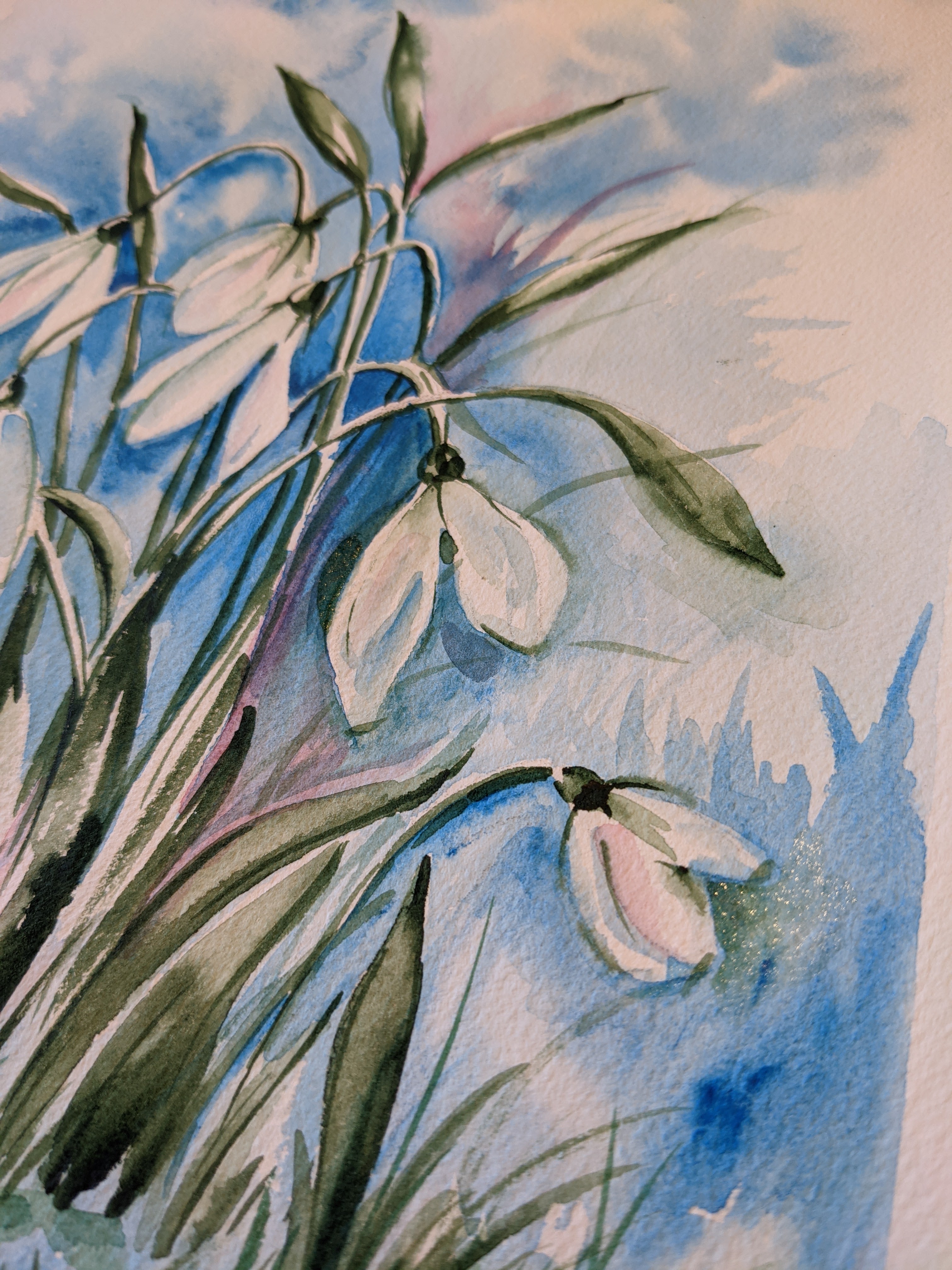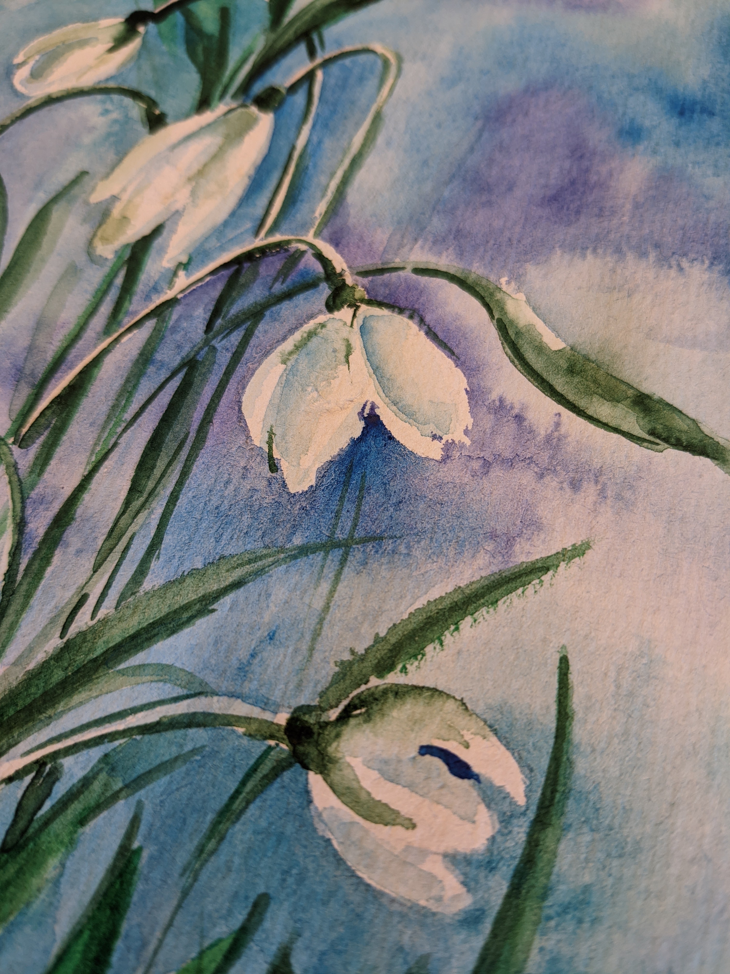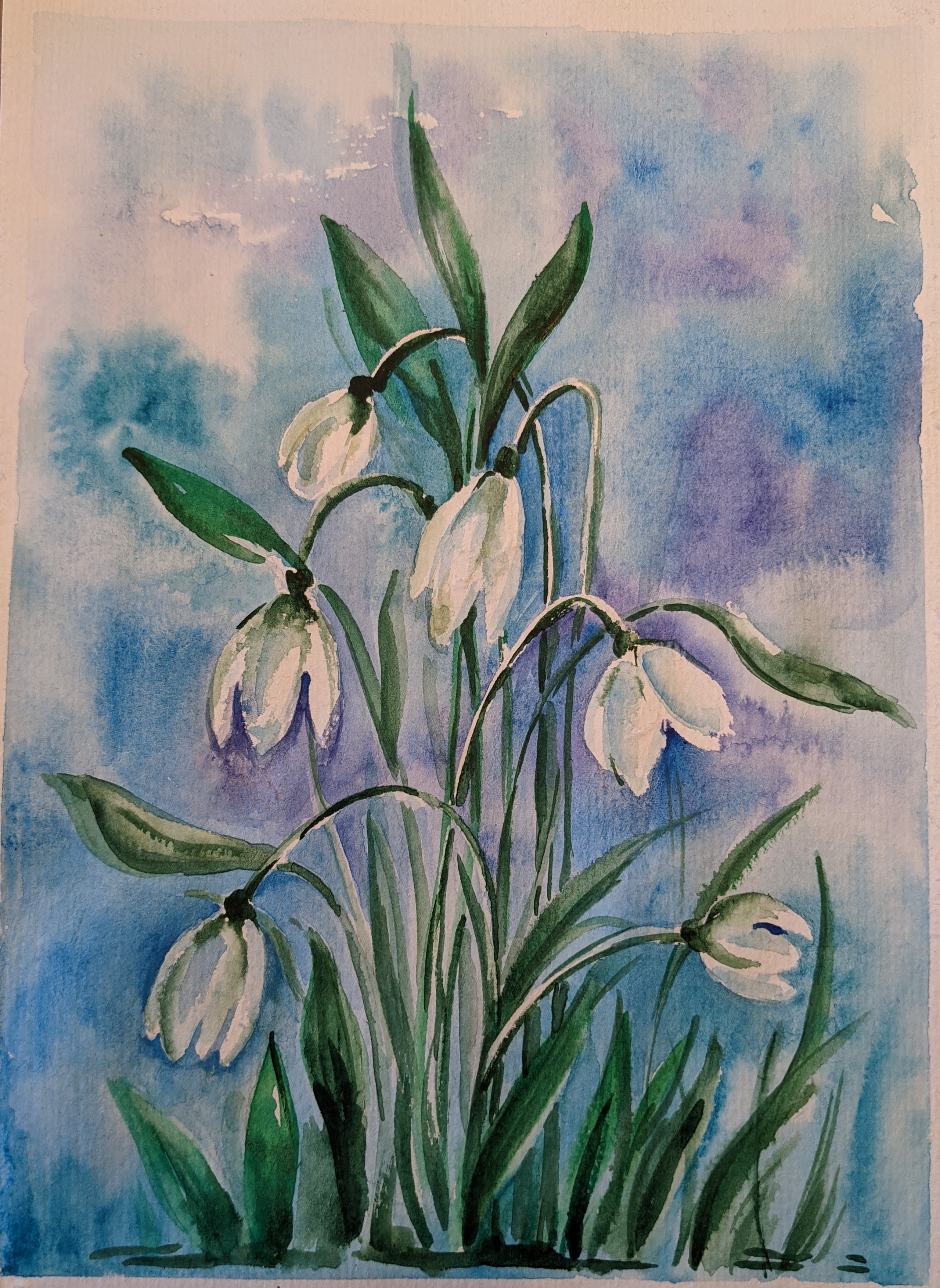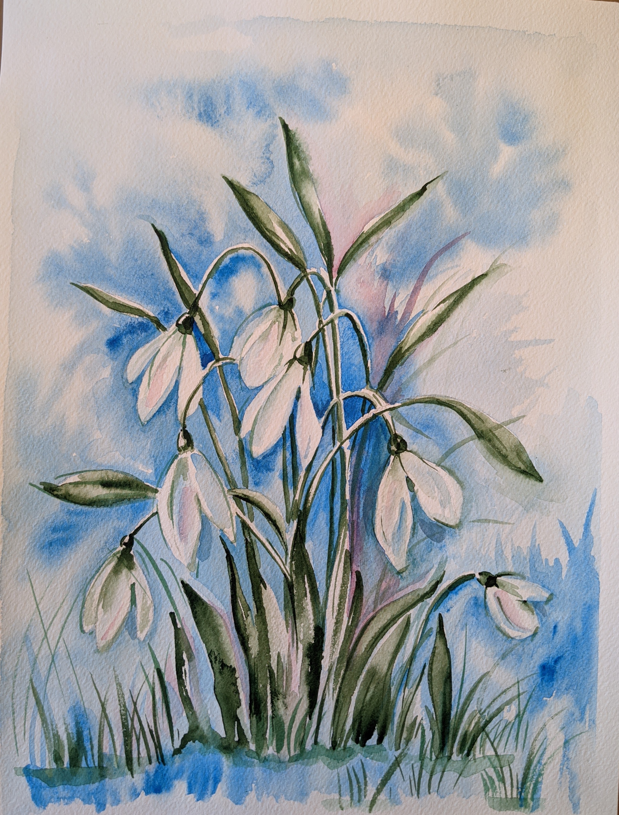 Snowdrops in watercolors was the first lesson this spring 🎨🖌️. We were studying different ways to draw snowdrops – the first video below shows the way to draw it using just watercolors on wet paper (and a pencil for a quick sketch).